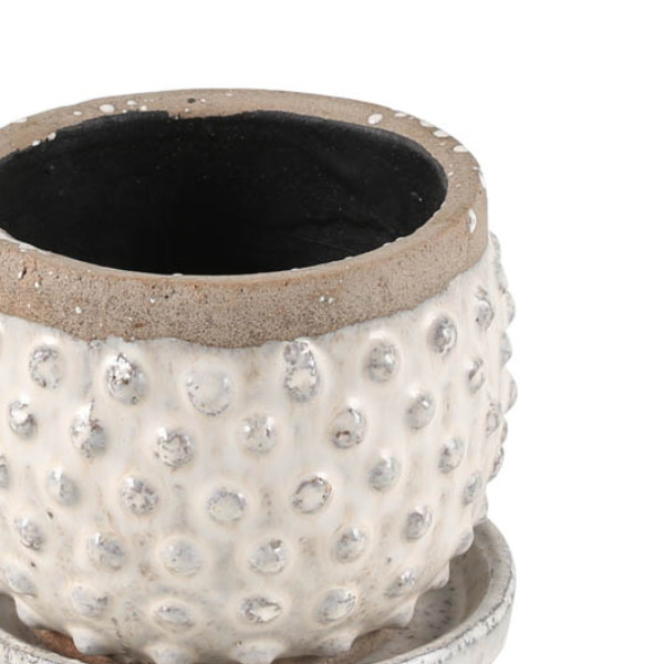 表面に施された泡のようなデザインが目を引く、小ぶりなサイズ感のポットです。ナチュラルで優しいカラーと、ハンドメイドならではの一点一点異なる風合いも魅力的です。お好みの植物を植えてあなたのグリーンライフをお楽しみください。