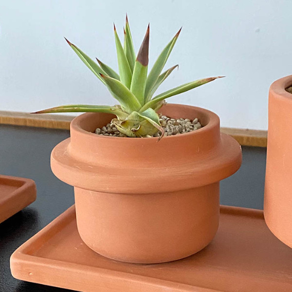 サボテンやコーデックスといったコレクション性の高い植物に見合うポットです。作家モノやプラスチック製の鉢が主流の中、もうひとつの選択肢として提案するのがテラコッタの植木鉢。 植木鉢としては定番の素材を、中に入れる植物とのバランスを考慮し、大胆なフォルムにリデザインすることで新たなインテリア性が生まれました。