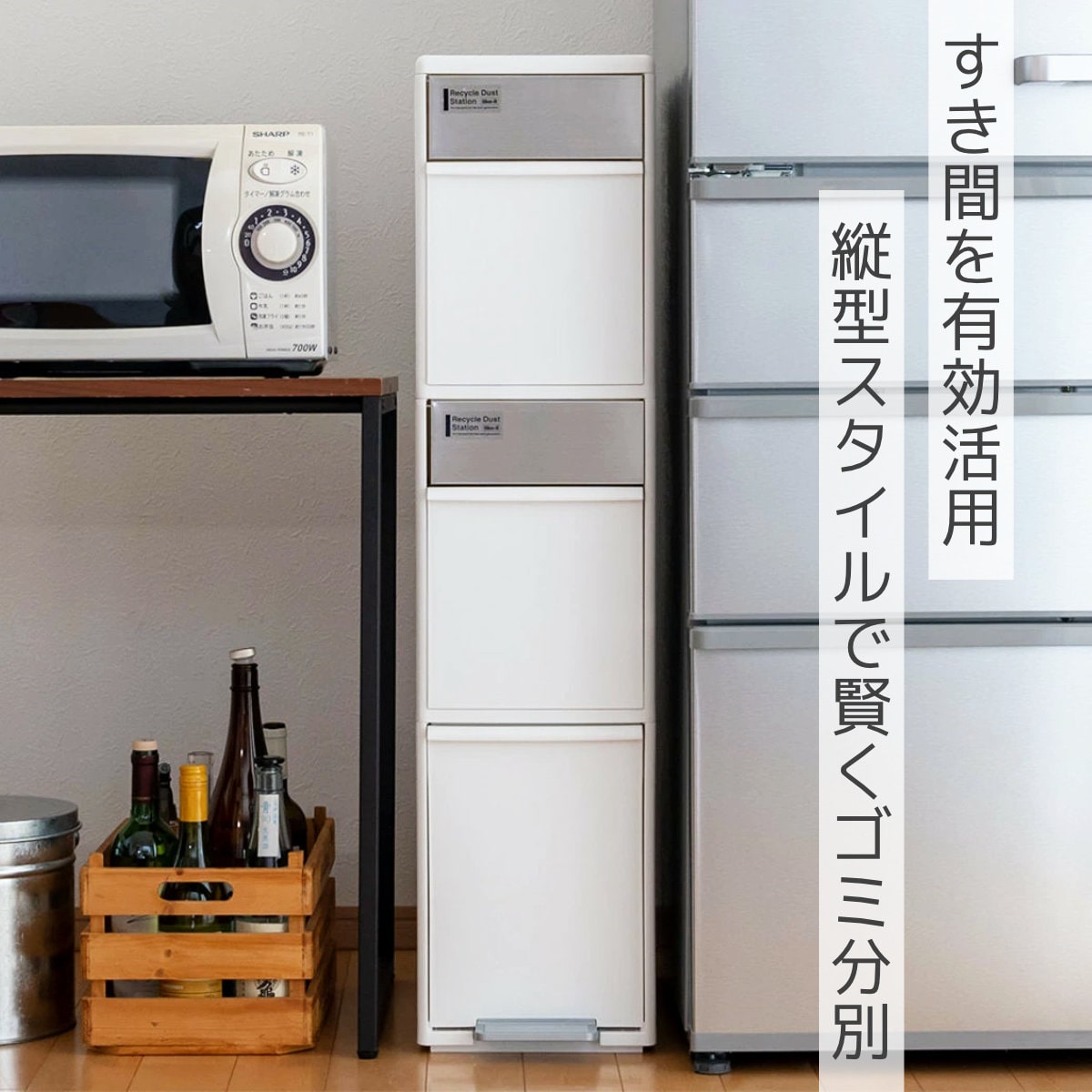 キッチンの空間を有効に使える、幅約25.5cmのスリムなゴミ箱です。冷蔵庫・シンク・食器棚横などのキッチンのデッドスペースに設置できて、ペットボトル・缶などのかさばる資源ゴミもひとまとめにできます。