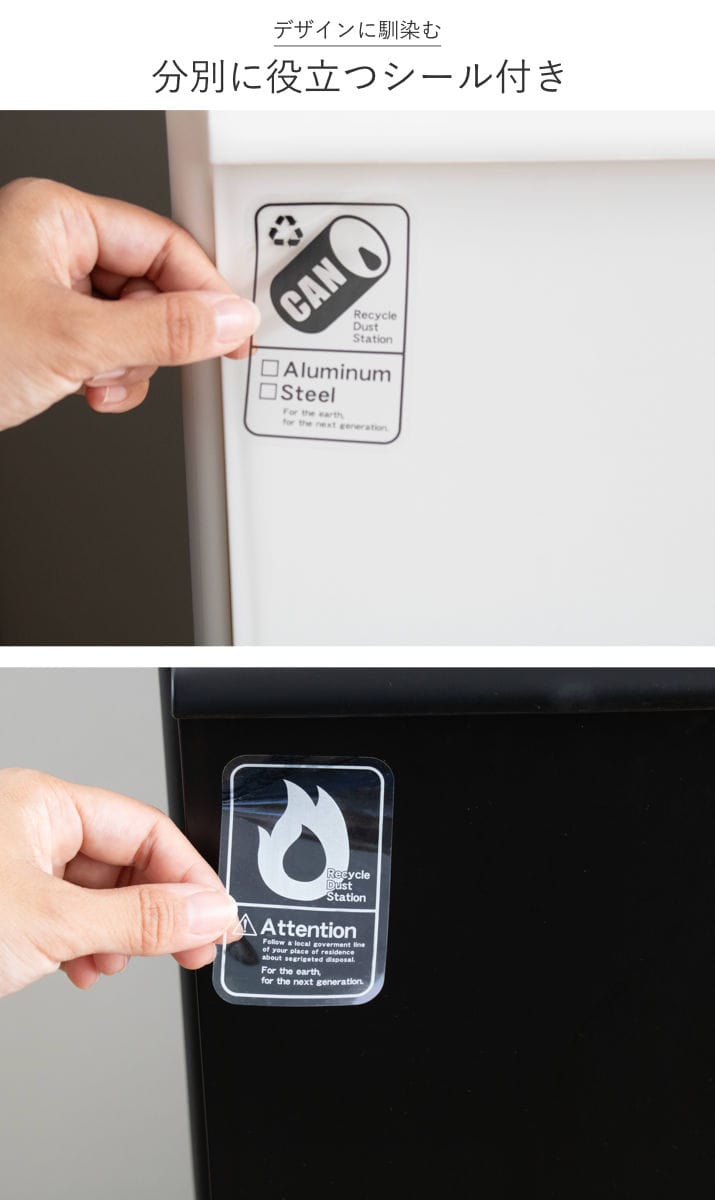上段にはプッシュすれば、片手でサッとゴミを捨てられるスイング式のふたがついています。汚れの落ちやすいステンレス素材を使用しており、お手入れしやすく美しい外観を保てます。