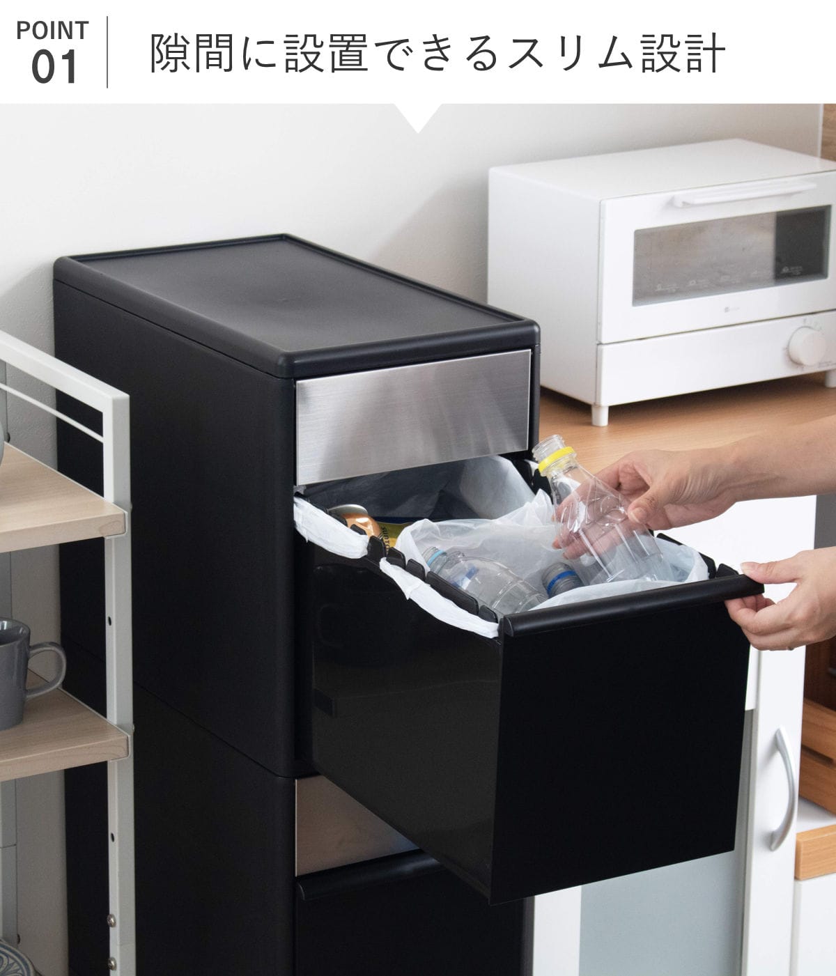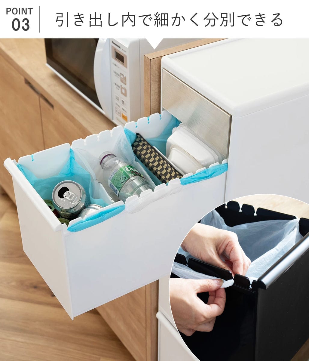 左右に並んだ切り込みフックに掛けるだけで、ポリ袋を簡単に装着できます。引き出しの奥行きを利用して1段で複数の分別が可能です。種類別にゴミ箱を用意しなくても、これ1台ですっきりと収まります。