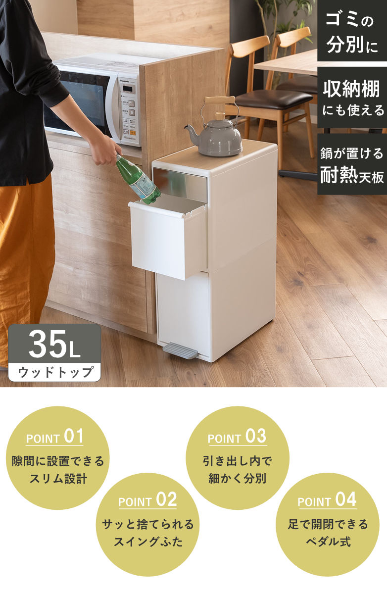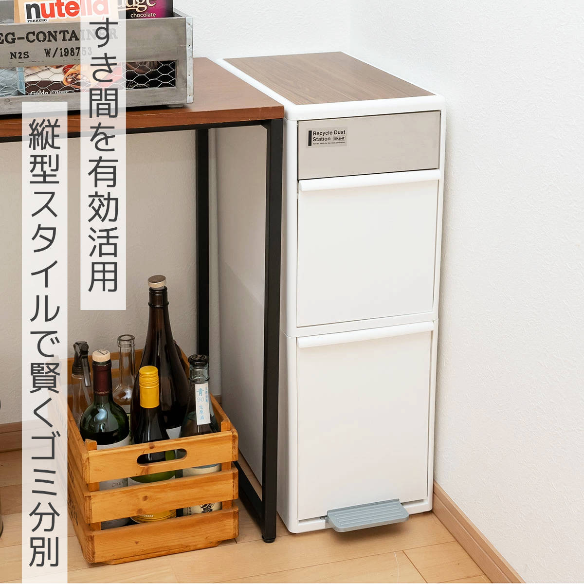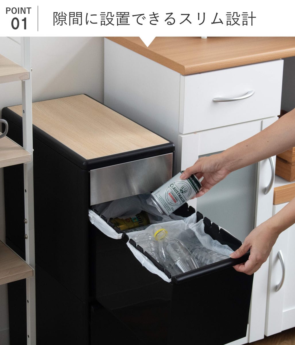 キッチンの空間を有効に使える、幅約25.5cmのスリムなゴミ箱です。冷蔵庫・シンク・食器棚横などのキッチンのデッドスペースに設置できて、ペットボトル・缶などのかさばる資源ゴミもひとまとめにできます。