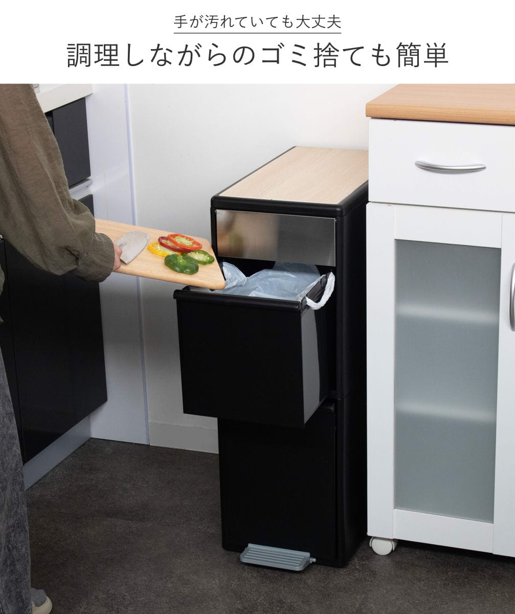 上段にはプッシュすれば、片手でサッとゴミを捨てられるスイング式のふたがついています。汚れの落ちやすいステンレス素材を使用しており、お手入れしやすく美しい外観を保てます。