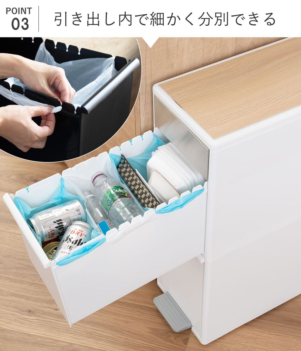 左右に並んだ切り込みフックに掛けるだけで、ポリ袋を簡単に装着できます。引き出しの奥行きを利用して1段で複数の分別が可能です。種類別にゴミ箱を用意しなくても、これ1台ですっきりと収まります。