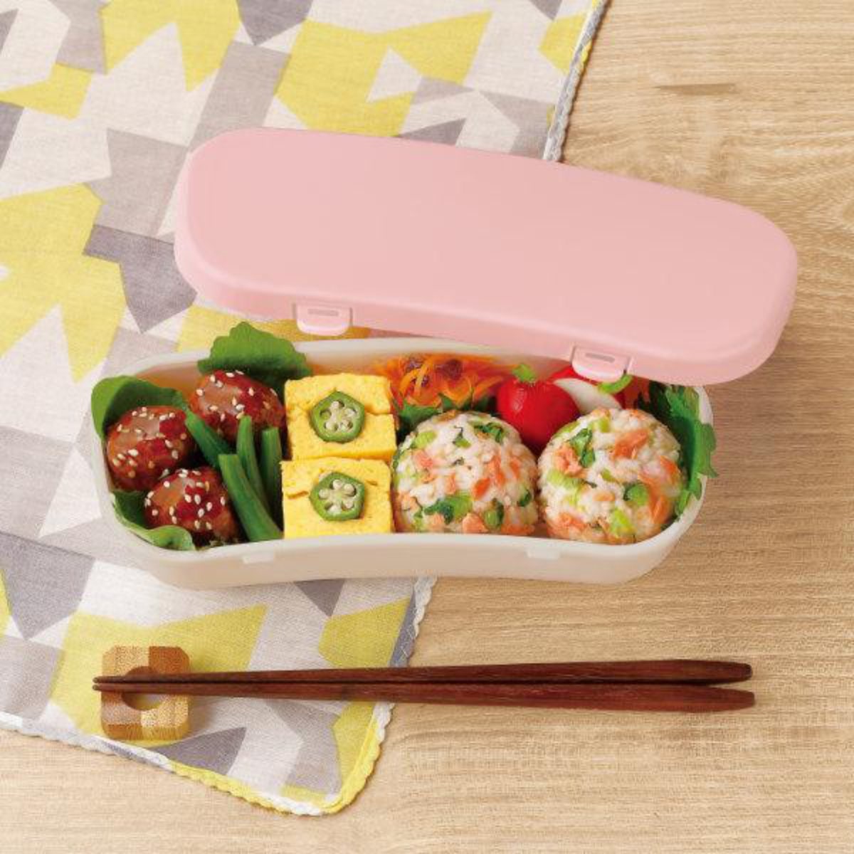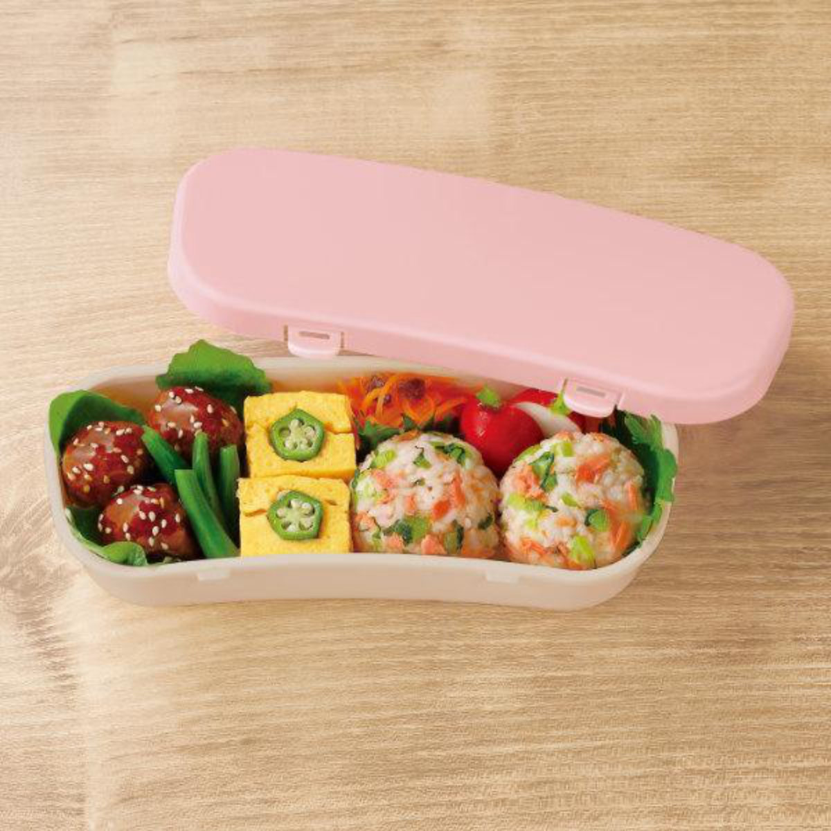美味しそうで、見栄えのいいお弁当は、詰め方がとても大切。横長でカーブを描いた形状は、ごはんやおかずが詰めやすいのが特徴です。長さがあるおかずも入れられます。仕切りがないから、いろんな詰め方ができるのもおすすめです。お昼休みに、フタを開けるのが楽しみになりそうなお弁当箱です。