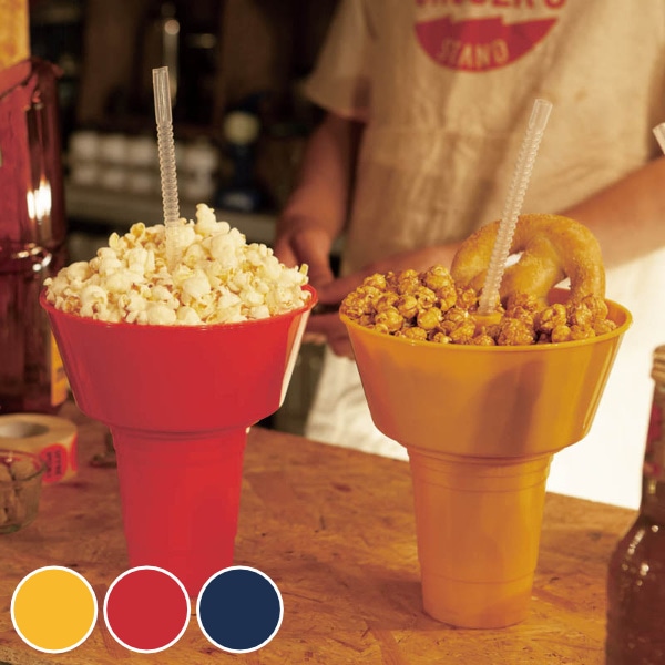 タンブラーの上のタブにポップコーンやスナックなどを入れて、片手で持ち歩けるアメリカンスタイルのタンブラーです。たっぷり入るサイズなので自宅で映画を見ながらくつろぐ時間にぴったり。両手がふさがることが無いので、ピクニックやキャンプなどのアウトドアシーンでも便利です。