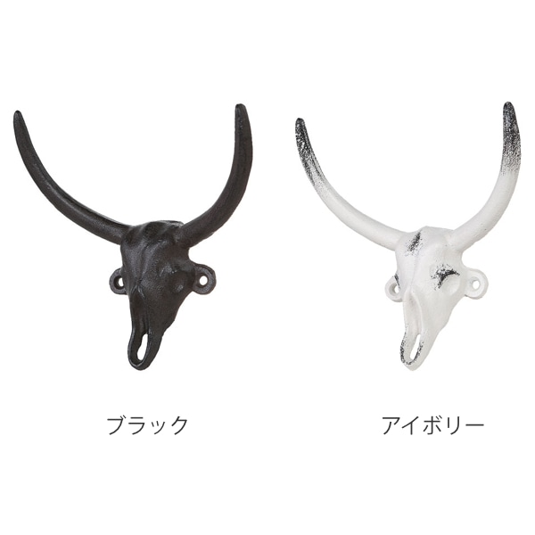 雄牛のスカルをモチーフにしたアイアン製のフックです。付属のネジで壁に取り付けます。角の部分がフックになっているデザインで、装飾としてのみならず実用性も兼ね備えています。