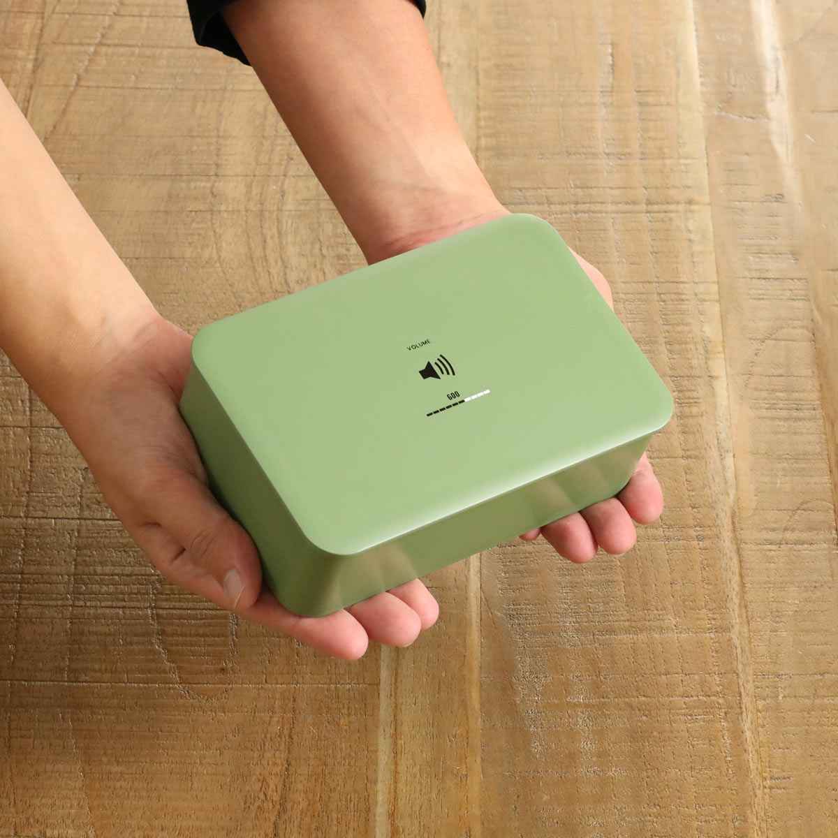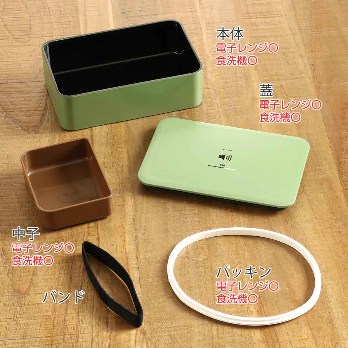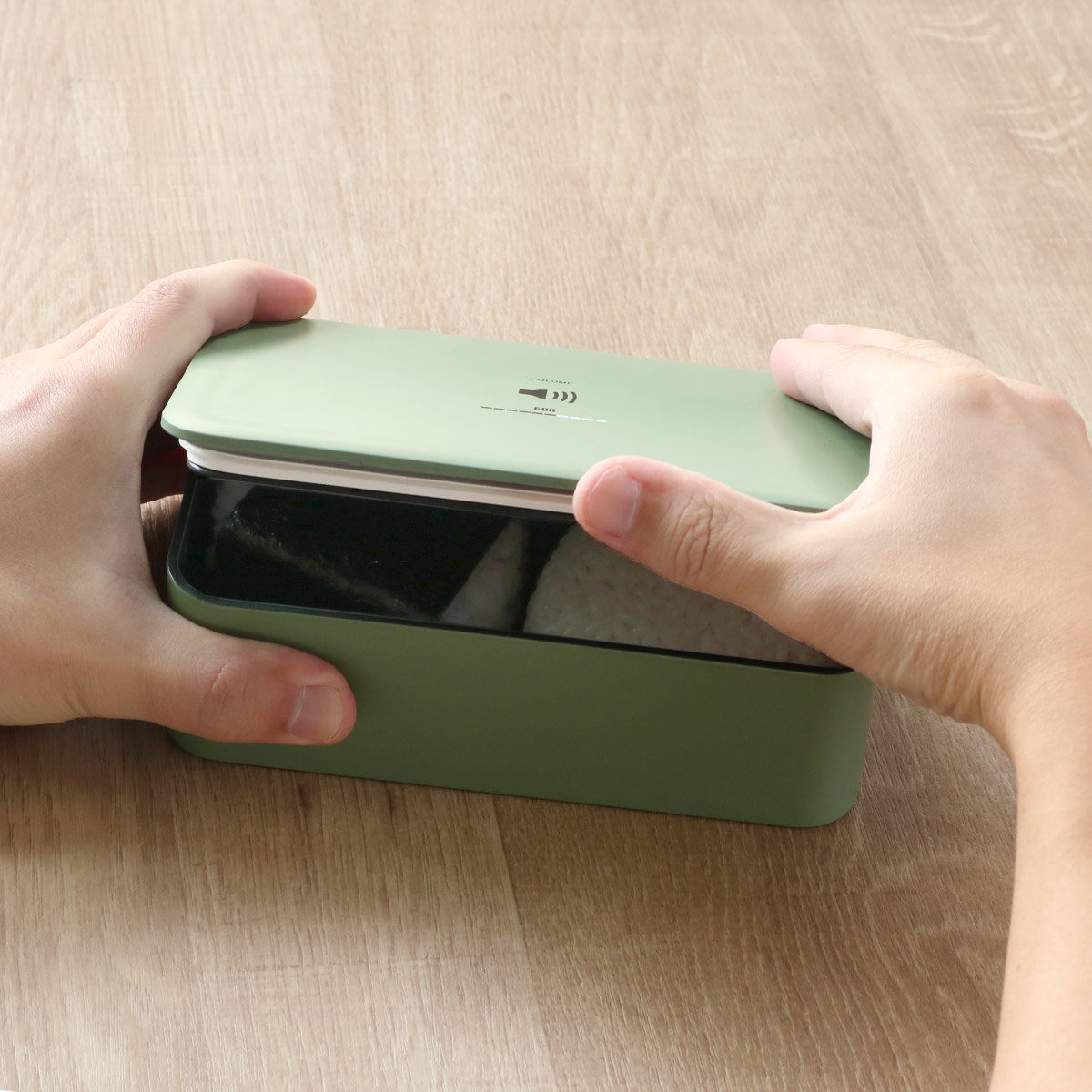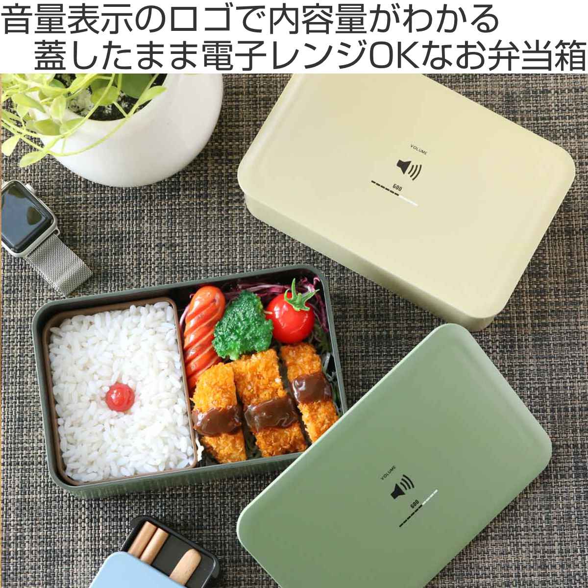 くすみカラーがオシャレなお弁当箱です。蓋の中央には容量を表した音量表示のロゴが入っています。サイズは600ml、800ml、1000mlと3サイズあるのでお好みのボリュームをお選びいただけます。