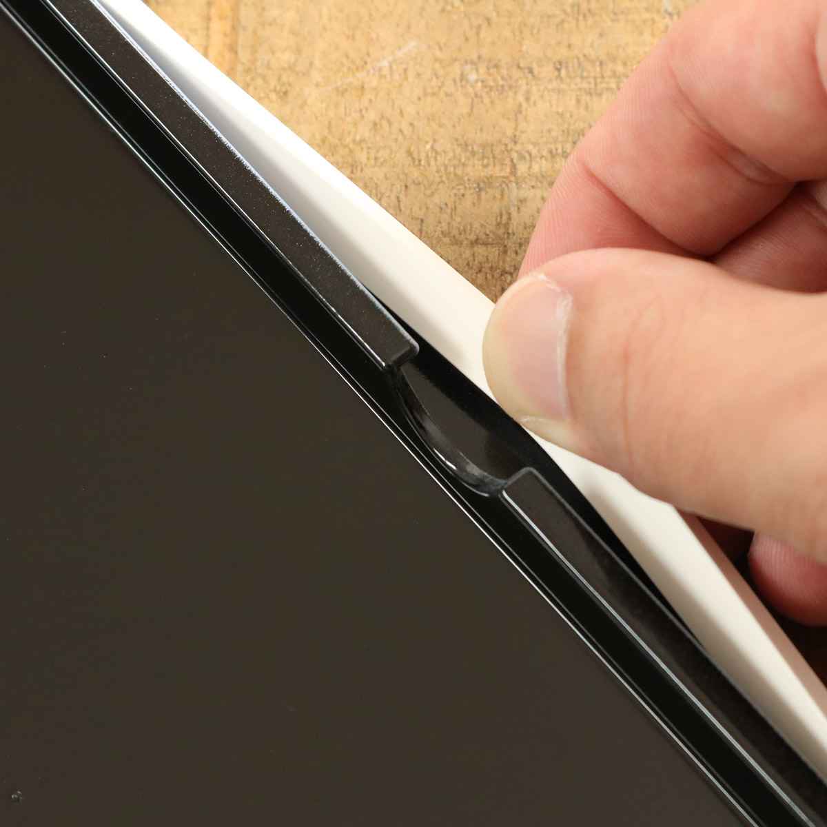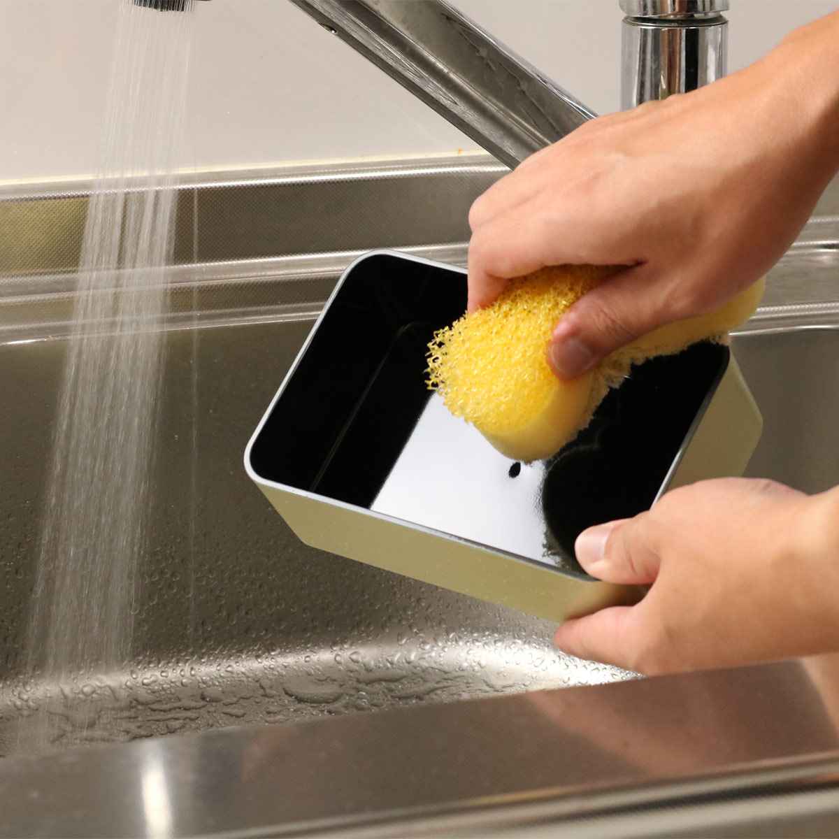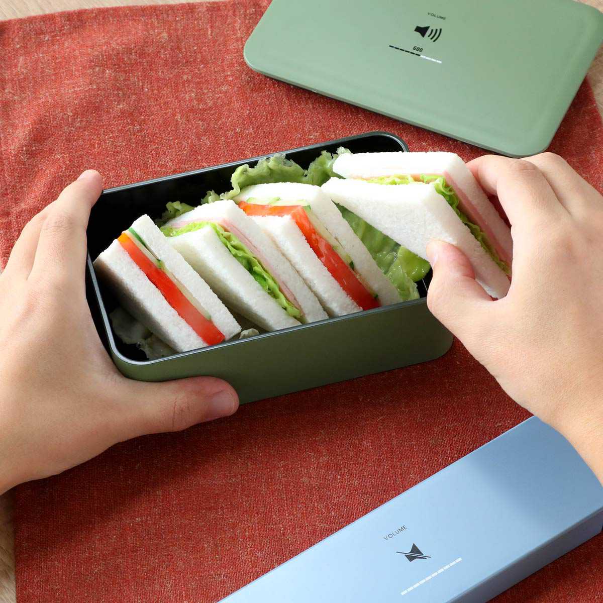 | 持ち運びに便利なバンド付き 付属のバンドでお弁当箱をしっかり固定して持ち運ぶことができます。 | 蓋の角を持ち上げると開けやすい お弁当箱本体を平らな机の上に置き、片手でしっかり押さえます。角を持ち上げるようにして開けるとスムーズに開けることができます。閉める際は空気が抜ける音がするまで、押さえて閉めてください。 |