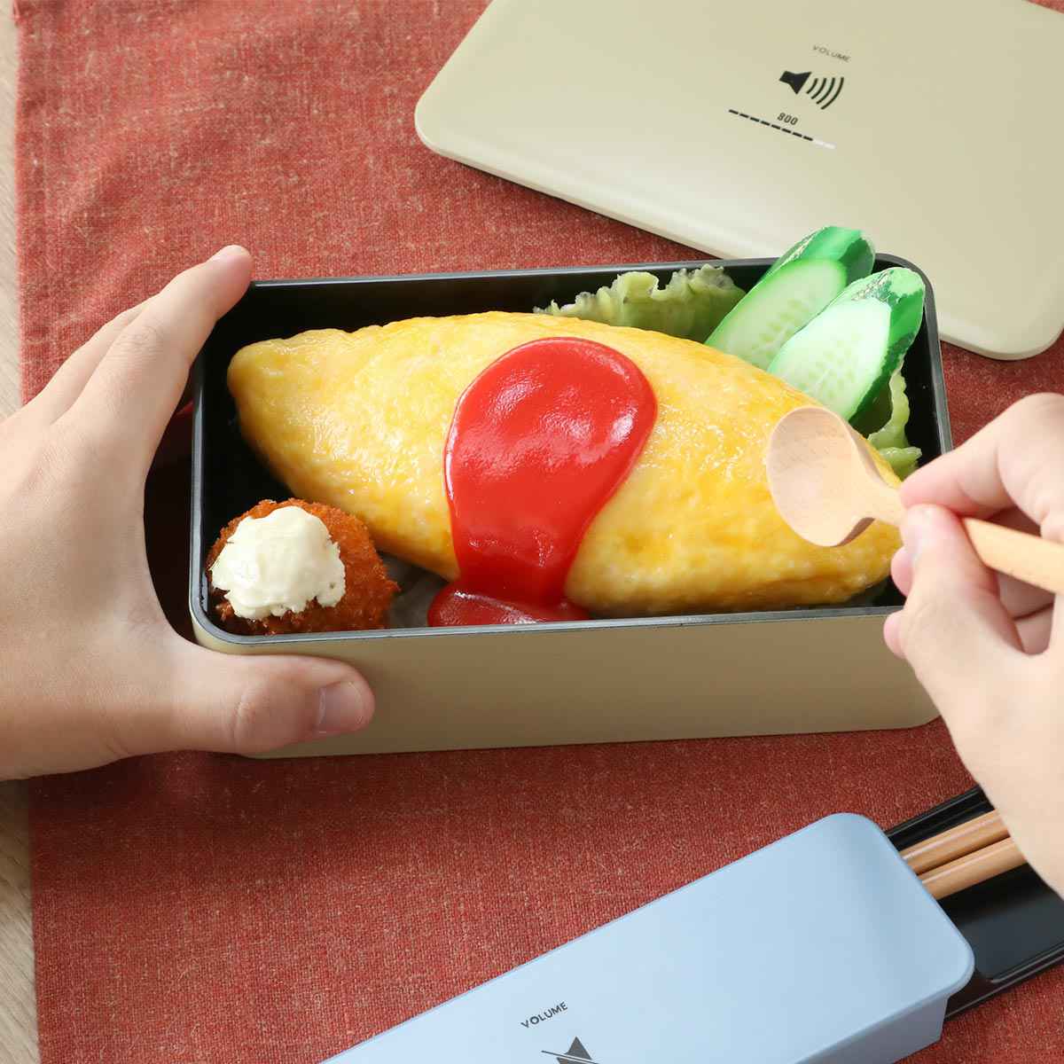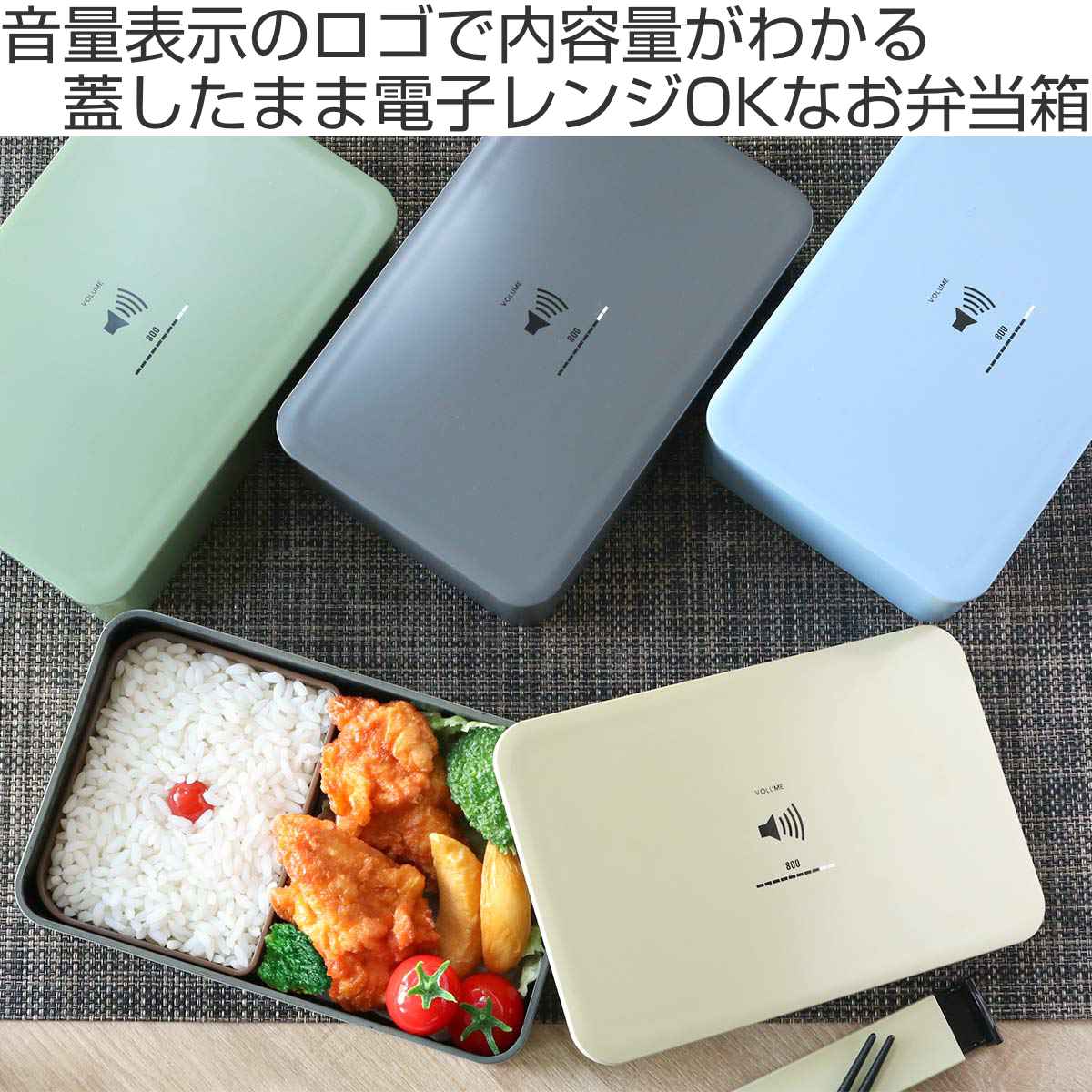 くすみカラーがオシャレなお弁当箱です。蓋の中央には容量を表した音量表示のロゴが入っています。サイズは600ml、800ml、1000mlと3サイズあるのでお好みのボリュームをお選びいただけます。