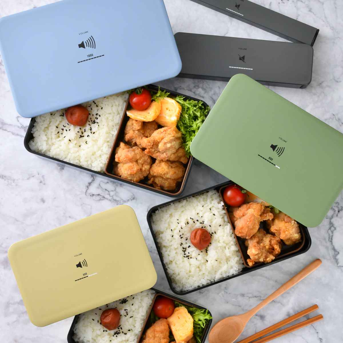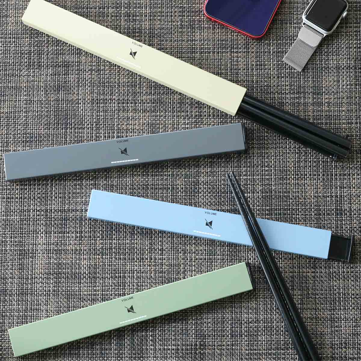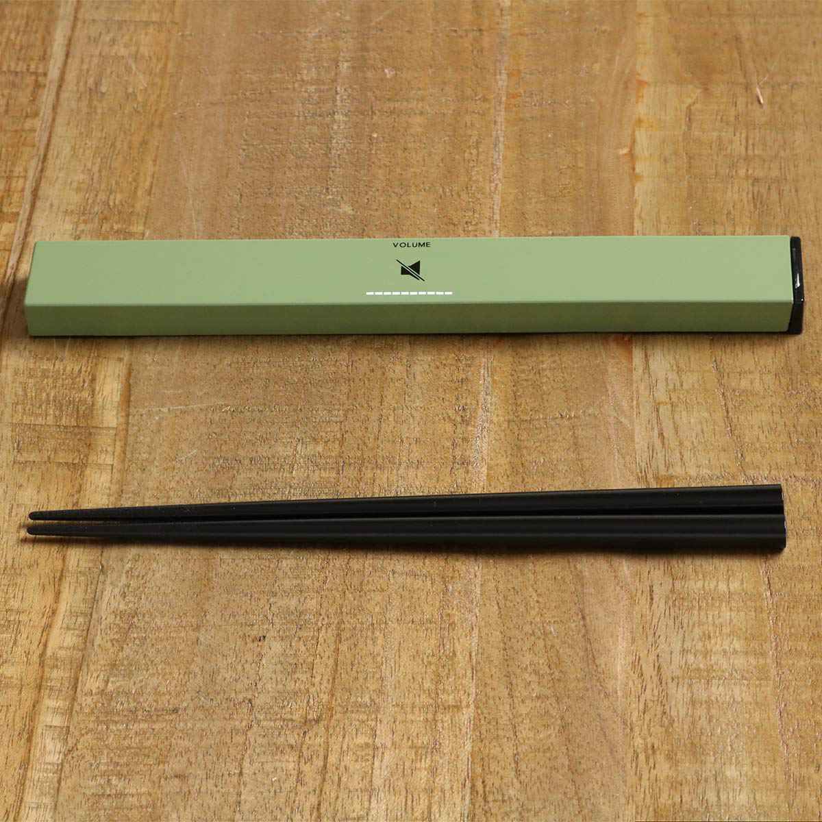 箸箱の中央の音量表示のロゴがアクセントになっています。