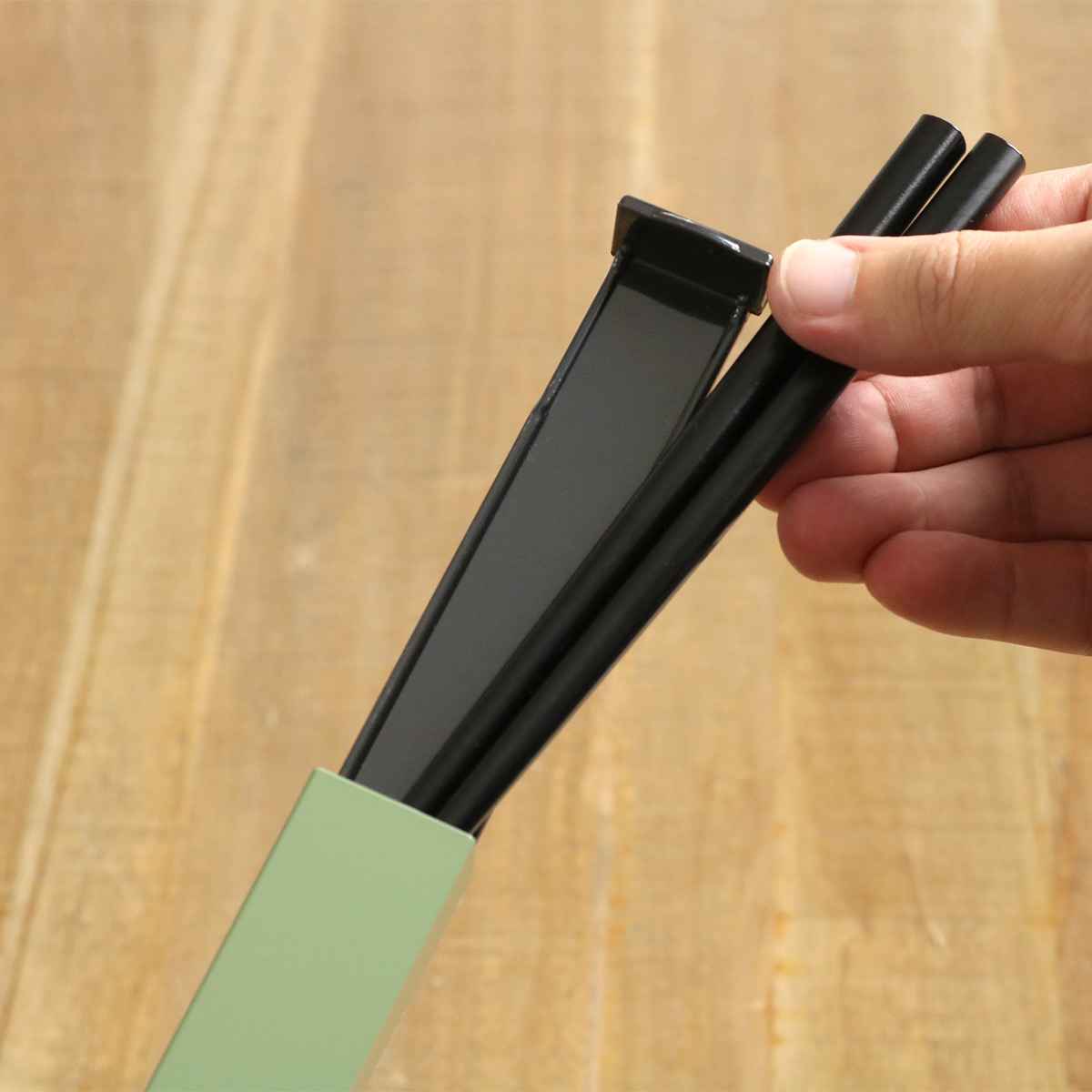 箸箱は開けやすいスライド式です。箸箱の受け部分には側面がないので横からサッとお箸を取り出すこともできます。