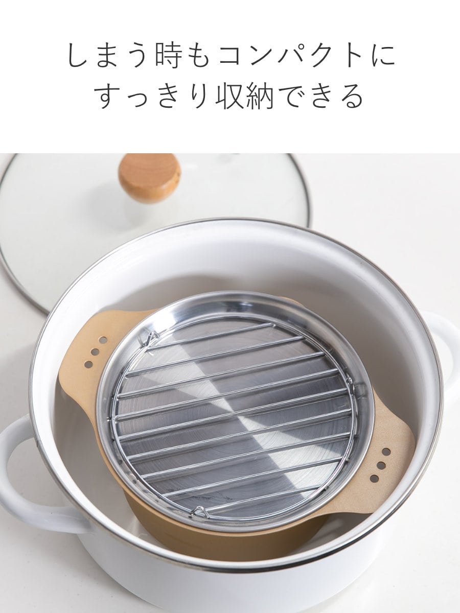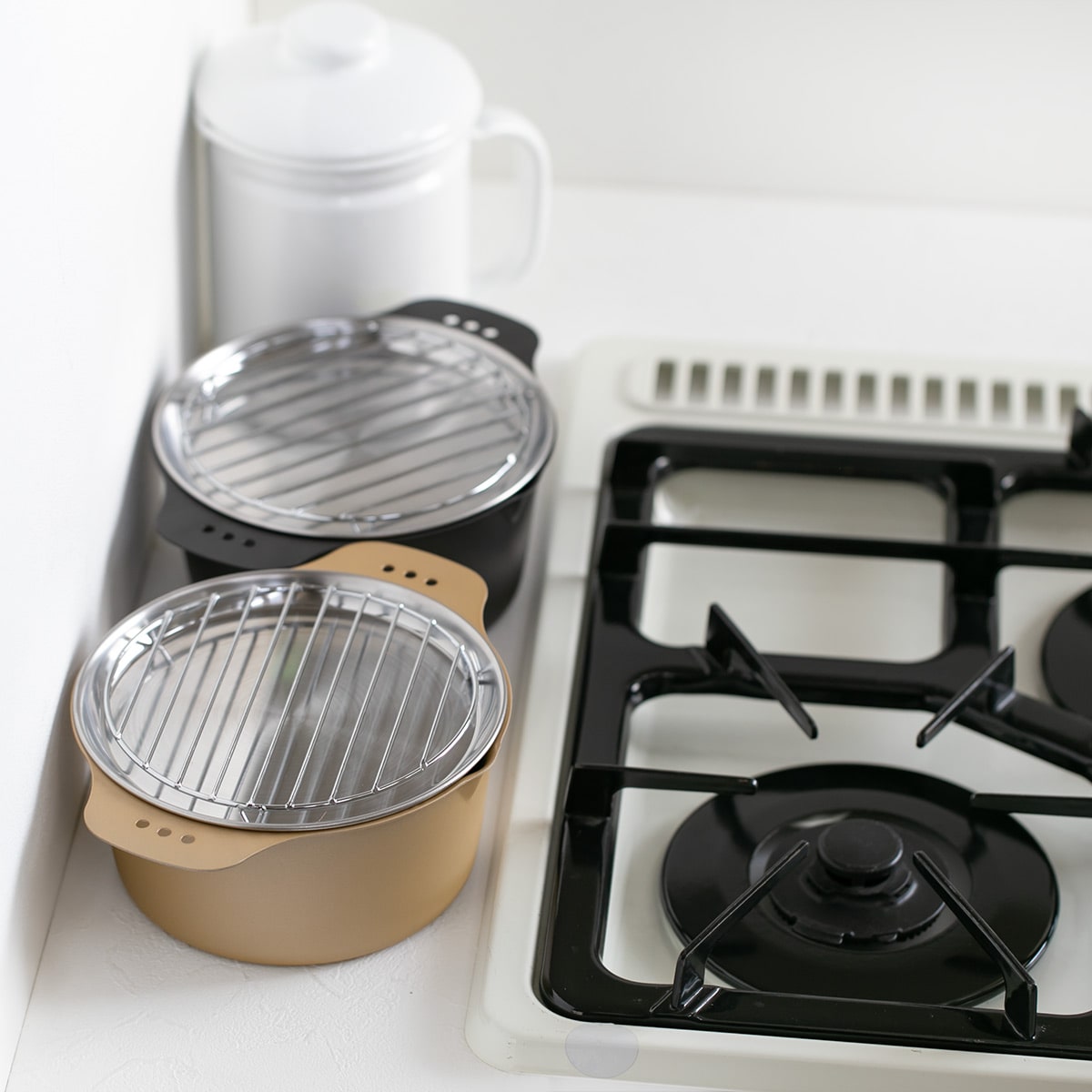 既にお持ちの揚げ鍋の中にもすっぽり収まるくらいの小さめサイズなので、かさばらず収納場所にも困りません。トレイとアミも本体にピッタリ収まるので、バラバラになって探す心配もありません。