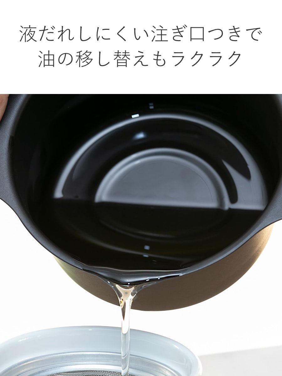 注ぎ口がついているので、油をオイルポットに移す作業もスムーズに行え、液だれしにくくなっています。