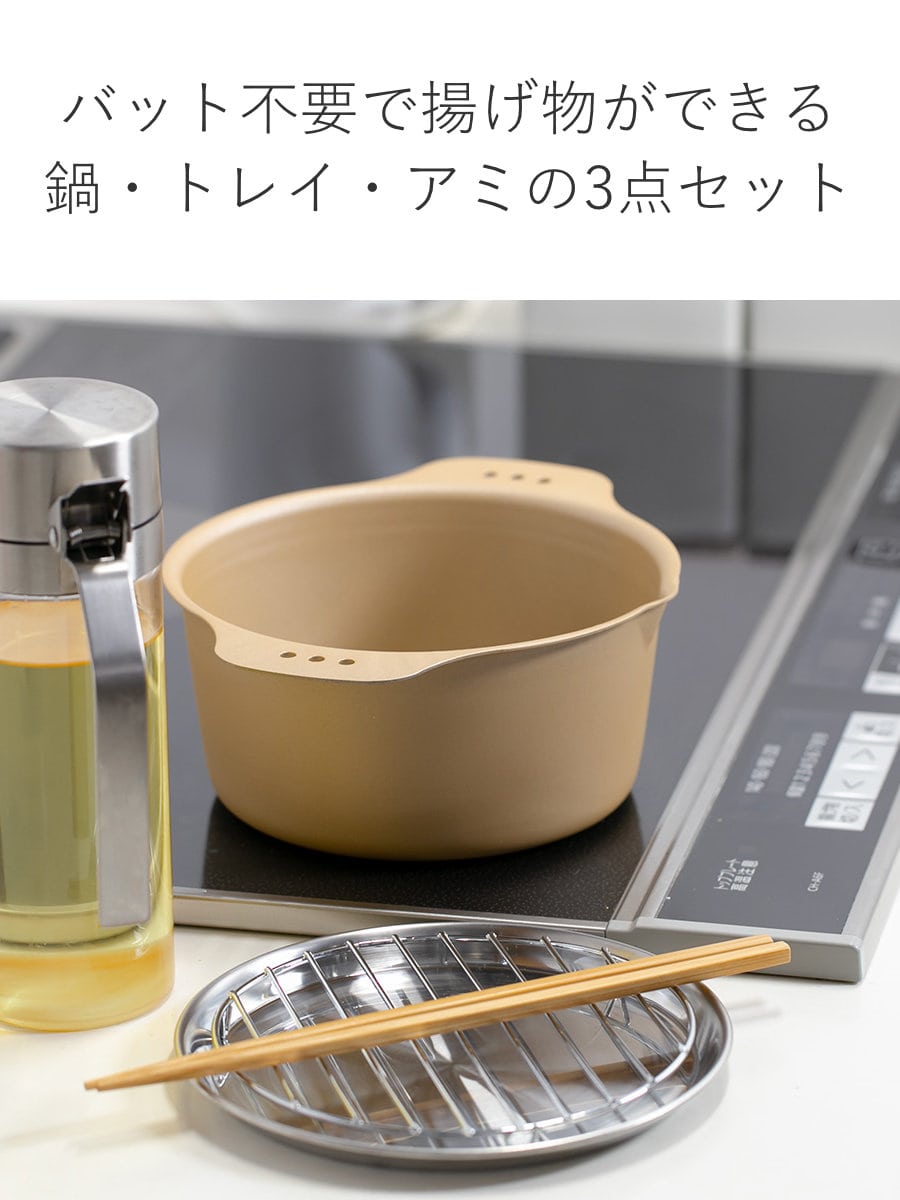 揚げ物調理がすぐに始められる、揚げ鍋・トレイ・アミの3点セットです。耐熱性に優れ、熱伝導率・保温性が高い鉄の揚げ鍋なので、丈夫で傷がつきにくく、油が馴染んで焦げ付きを防いでくれるため、長く愛用いただけます。