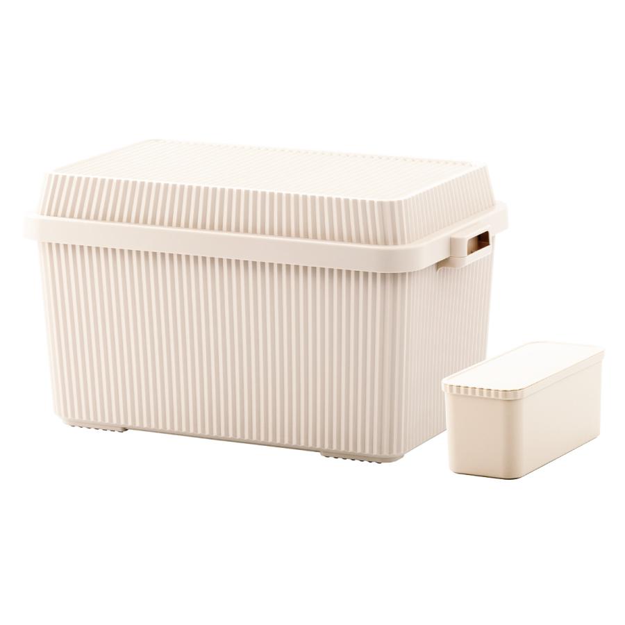 | サイズ | 【コンテナー外寸】 約 幅70.7×奥行42.2×高さ40(cm)( ハンドル含む ) 【コンテナボックス内寸】上部 :約 幅62×奥行38.2(cm) 下部 :約 幅57.9×奥行33.6(cm) フタ取り付け時の高さ:約37(cm) 【インナーボックス】 (約)幅36.2×奥行14.8×高さ15.2(cm) |
