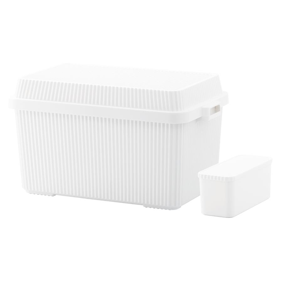 | サイズ | 【コンテナー外寸】 約 幅70.7×奥行42.2×高さ40(cm)( ハンドル含む ) 【コンテナボックス内寸】上部 :約 幅62×奥行38.2(cm) 下部 :約 幅57.9×奥行33.6(cm) フタ取り付け時の高さ:約37(cm) 【インナーボックス】 (約)幅36.2×奥行14.8×高さ15.2(cm) |