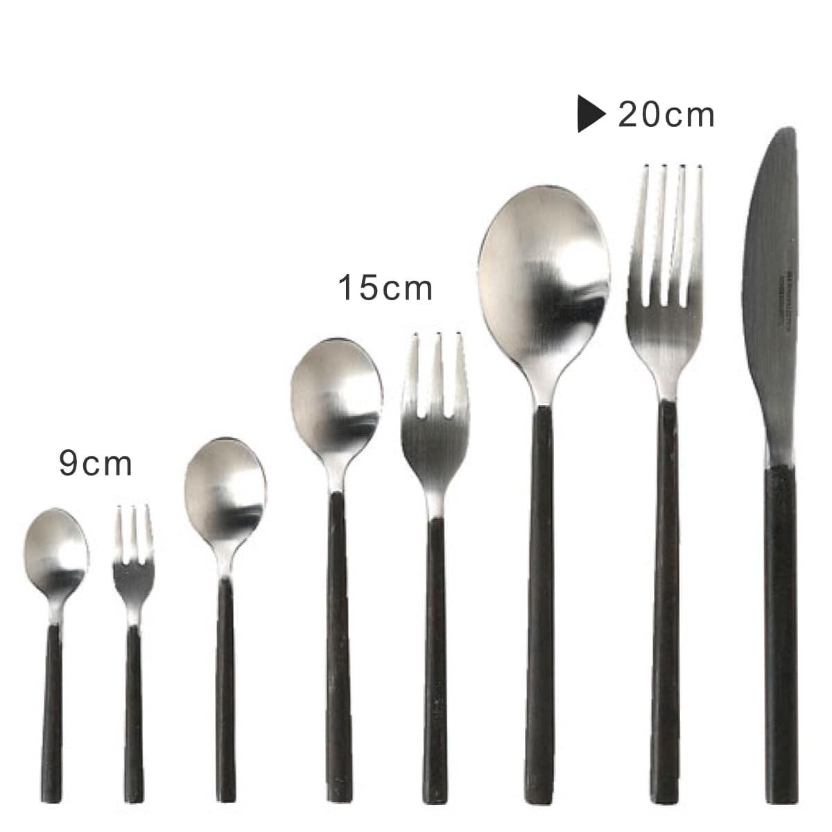 ステンレスのハンドルに焼き付け加工を施し、シックで無骨なデザインに仕上げた「ヴァンデュール」カトラリーシリーズです。コーヒースプーンやデザートフォーク、ディナースプーンにナイフまで、同じデザインで揃えてテーブルに統一感を演出できます。