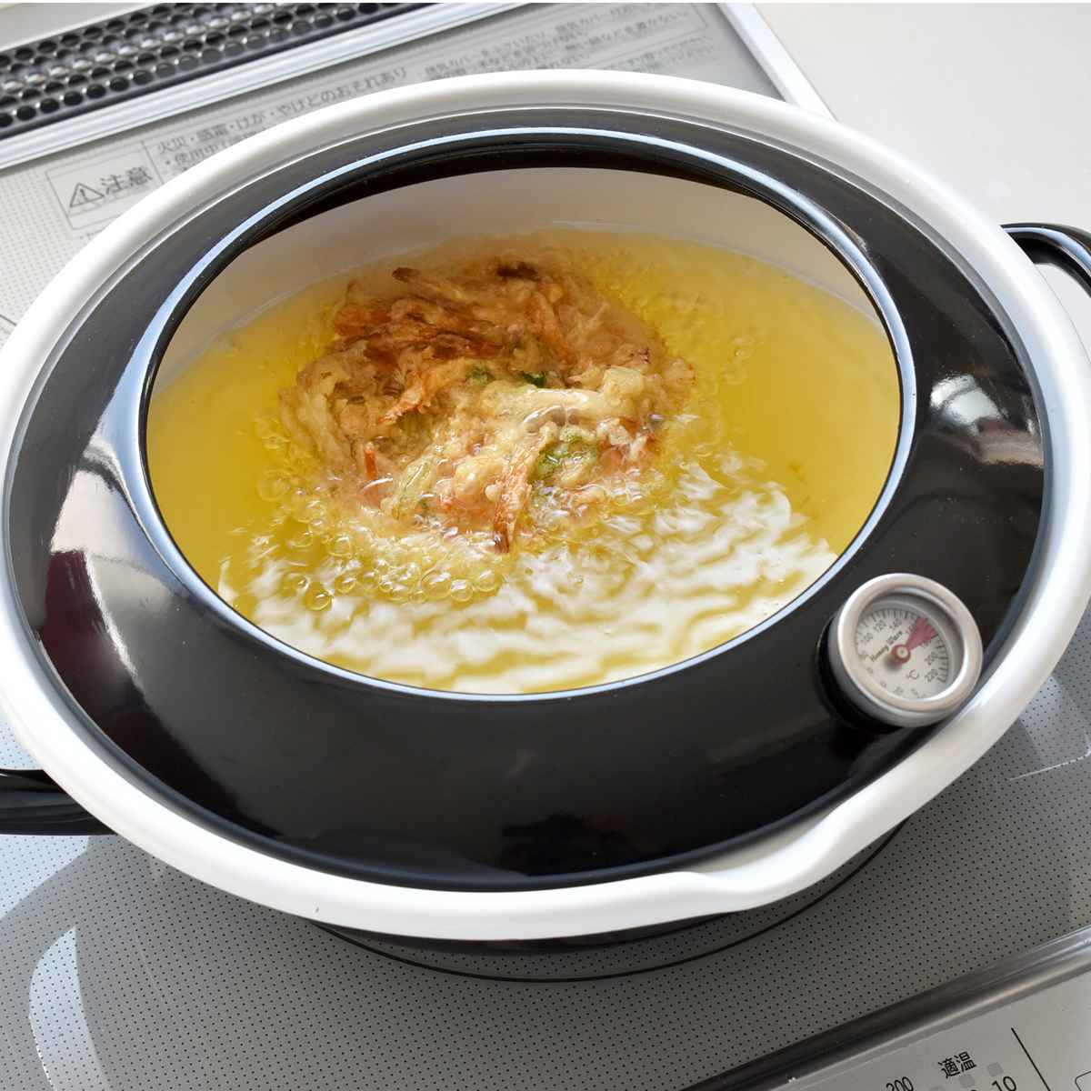 金属の熱伝導率のよさとガラスの非吸着性に加え保温性にも優れているため、食材を入れても温度が下がりにくく、カラッとした揚げ物に仕上がります。