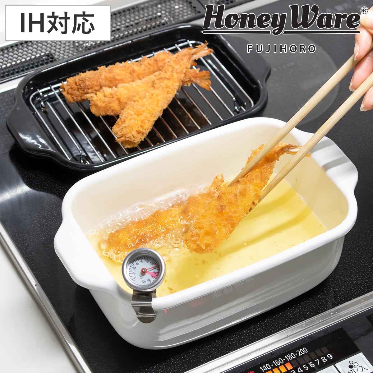 防水型の温度計・バット・すのこ網がセットになっているので、手軽に揚げ物料理にチャレンジできます。バットは下準備にも使え、調理中は網を組み合わせて油切りの受け皿として使用できます。調理中の温度管理に便利な温度計は、220度まで測定可能です。