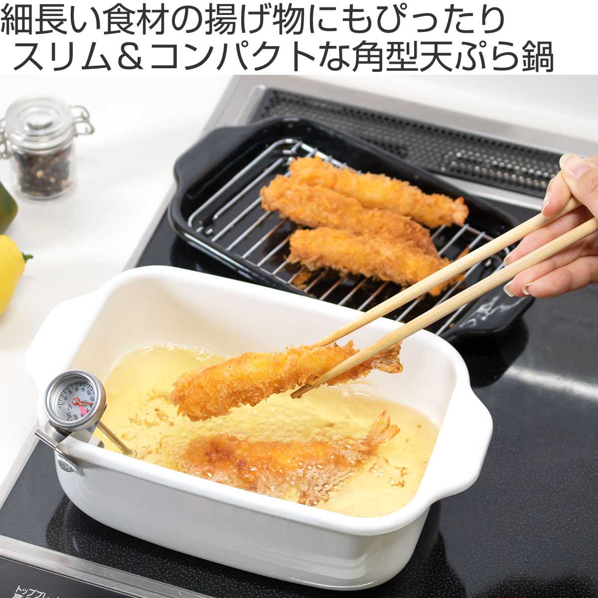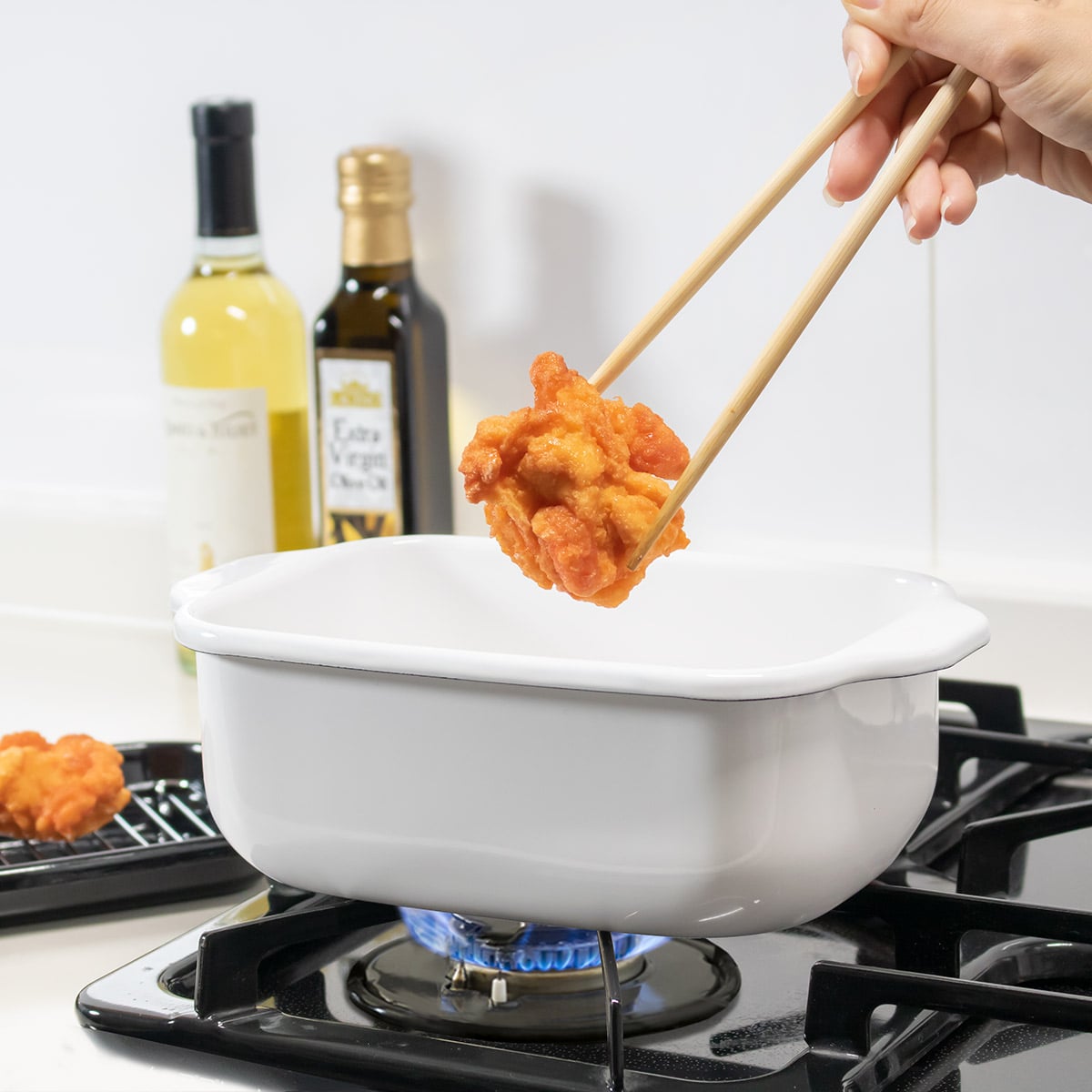 ホーロー素材の特性を活かした角型天ぷら鍋にワイドサイズが登場しました。スリムは1~2人分やお弁当のちょっとした揚げ物に適しており、ワイドは3~4人分の揚げ物に適しています。それでも丸形の天ぷら鍋に比べてコンパクトで扱いやすいです。