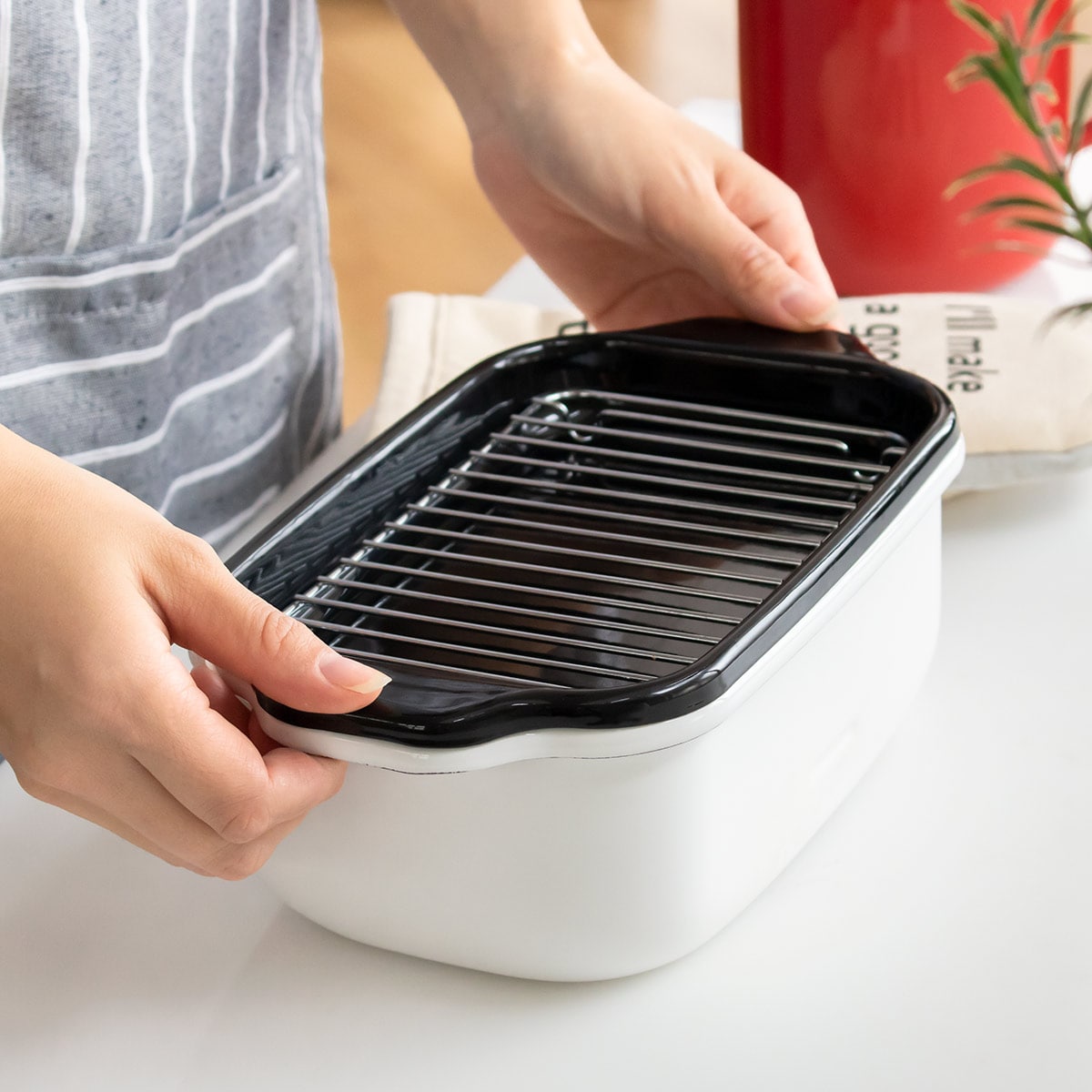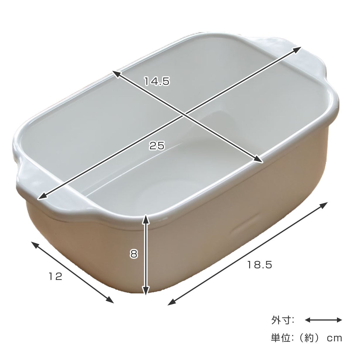 | サイズ | 【本体】 約 幅25×奥行14.5×8(cm) 底面:約 幅18.5×奥行12(cm) 重量:677g 【バット】 約 幅25×奥行14.5×高さ2.8(cm) 重量:314g 【スノコ網】 約 幅18.2×奥行11.2×高さ1(cm) 重量:62g 【収納時】 約 幅25×奥行14.5×高さ9(cm) 重量:1.05kg |