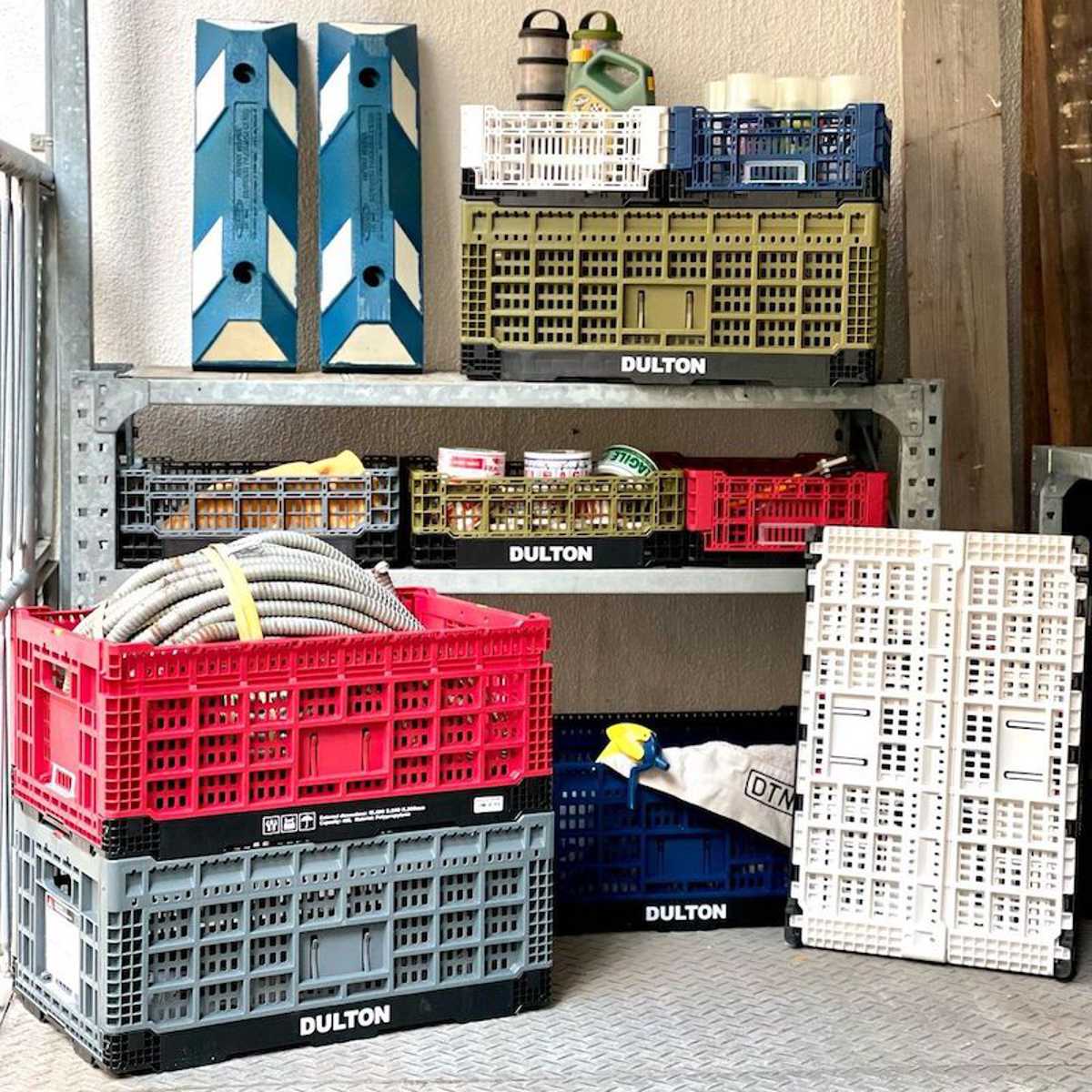 必要な時は組み立てて使わない時は折りたたんで収納できる、折りたたみ式ストレージです。果物や植物、工業パーツの運搬用に開発されたものなので、耐久性や汎用性に富んでいます。丈夫なので、ガレージやストックルームの工具整理などにも最適です。