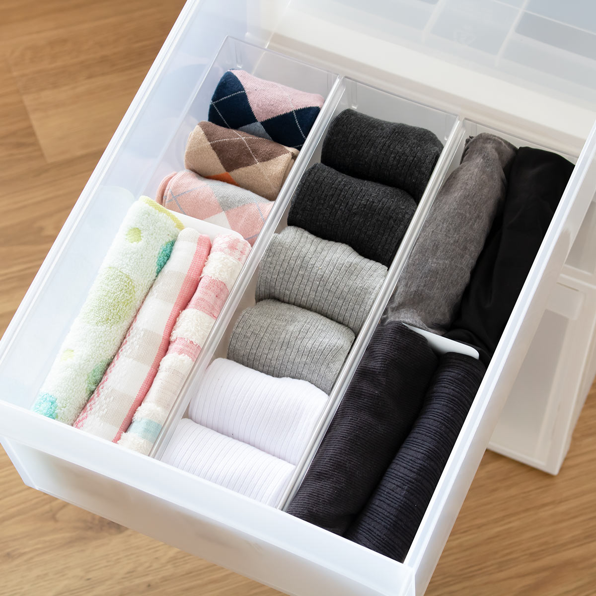 仕切りケースごと動かせるので、衣替え等でケースの配置を変えたいときもラクラクです。