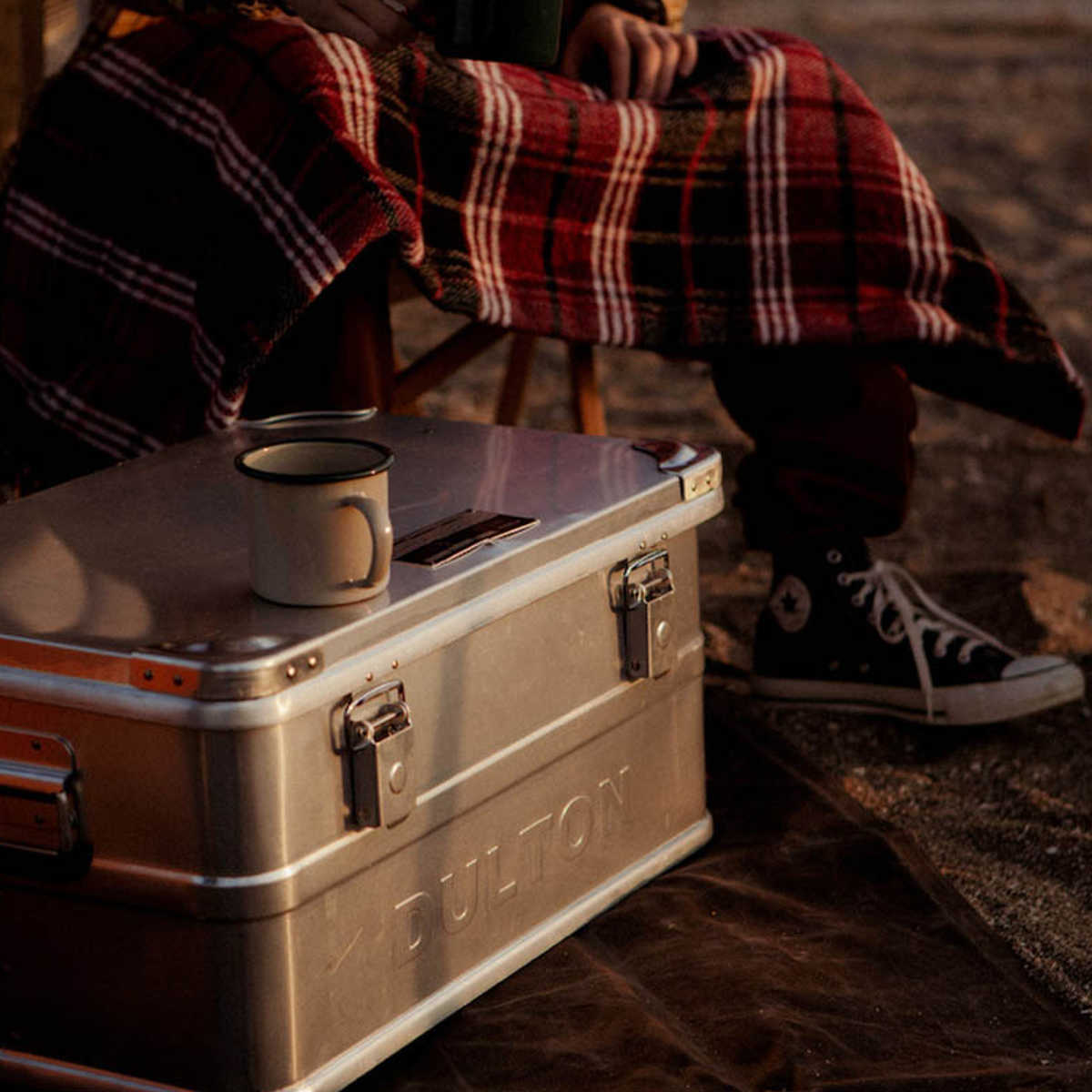 Mサイズは車に積むのにちょうどいい大きさです。フタ表面に派手な装飾が無く平面なので、上にちょっとした物を置けます。熱いものを置いても平気なアルミニウム製のため、ミニテーブルとしても活用できます。シングルバーナー等を使って食事をするキャンプにもうってつけです。