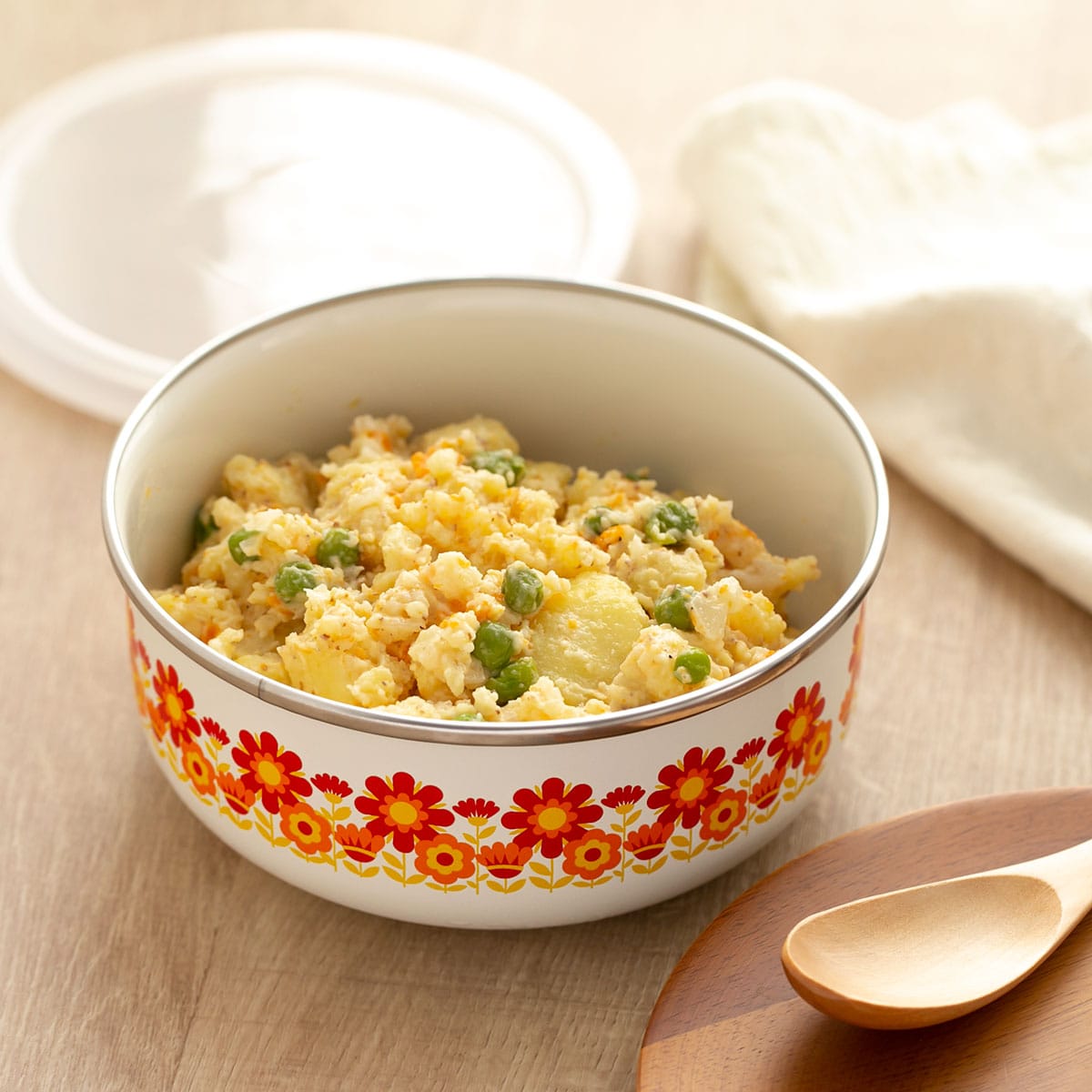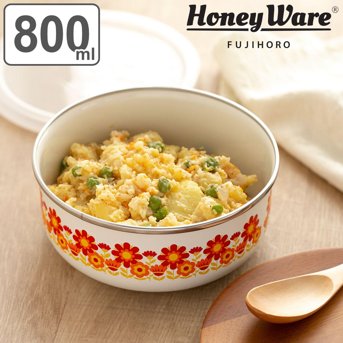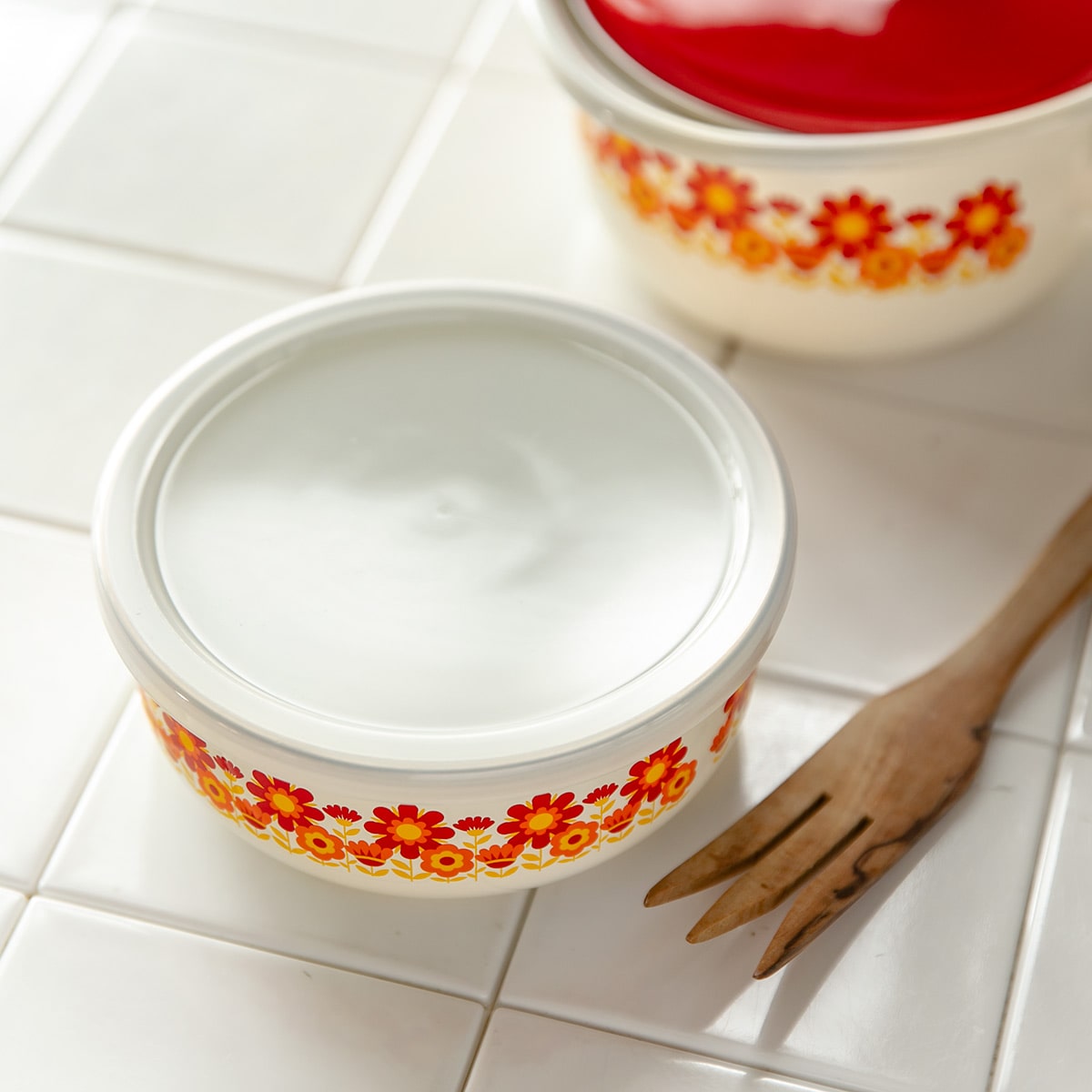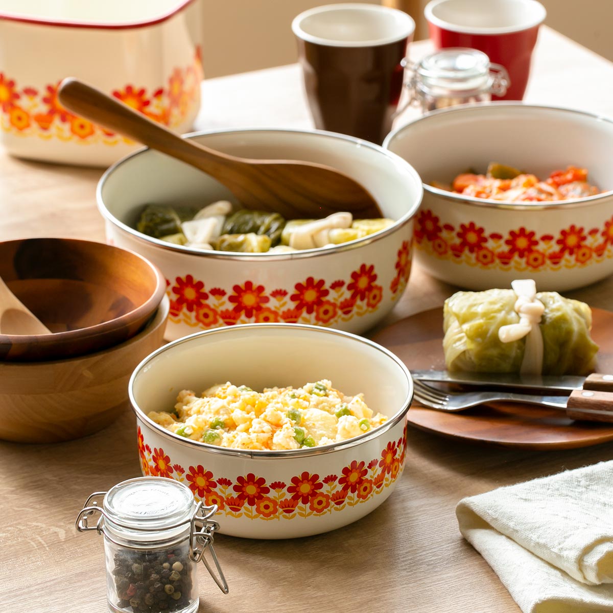バット代わりに使って下ごしらえ、そのまま直火やオーブンにかけて調理と保存以外にも活躍します。レトロな雰囲気と鮮やかなデザインは、冷蔵庫から出してそのまま食器として食卓で使用することができます。