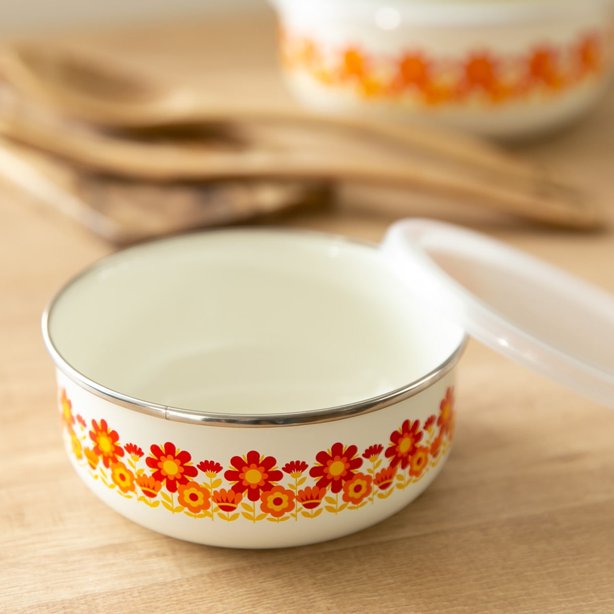 容器側面には、1970年代を代表するサンフラワー柄が描かれています。鮮やかなひまわりが赤く太陽のように燃えるキュートなデザインで、キッチンを明るく彩ってくれます。また、容器の縁にはステンレスが巻かれており、容器の端部を衝撃などから保護してくれます。