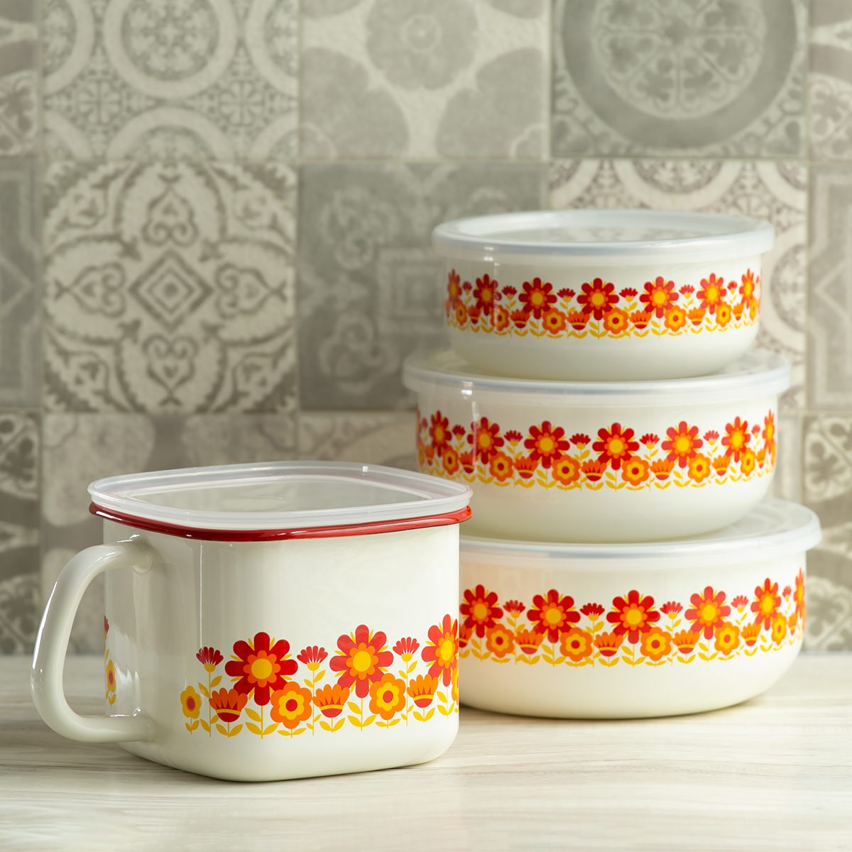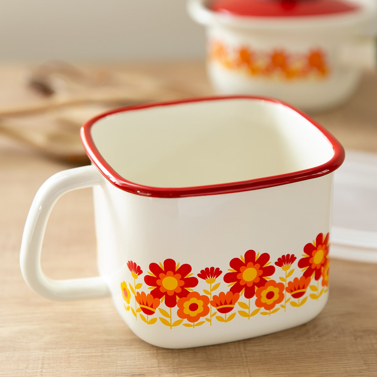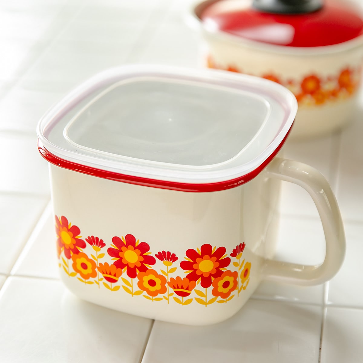 容器側面には、1970年代を代表するサンフラワー柄が描かれています。鮮やかなひまわりが赤く太陽のように燃えるキュートなデザインで、キッチンを明るく彩ってくれます。