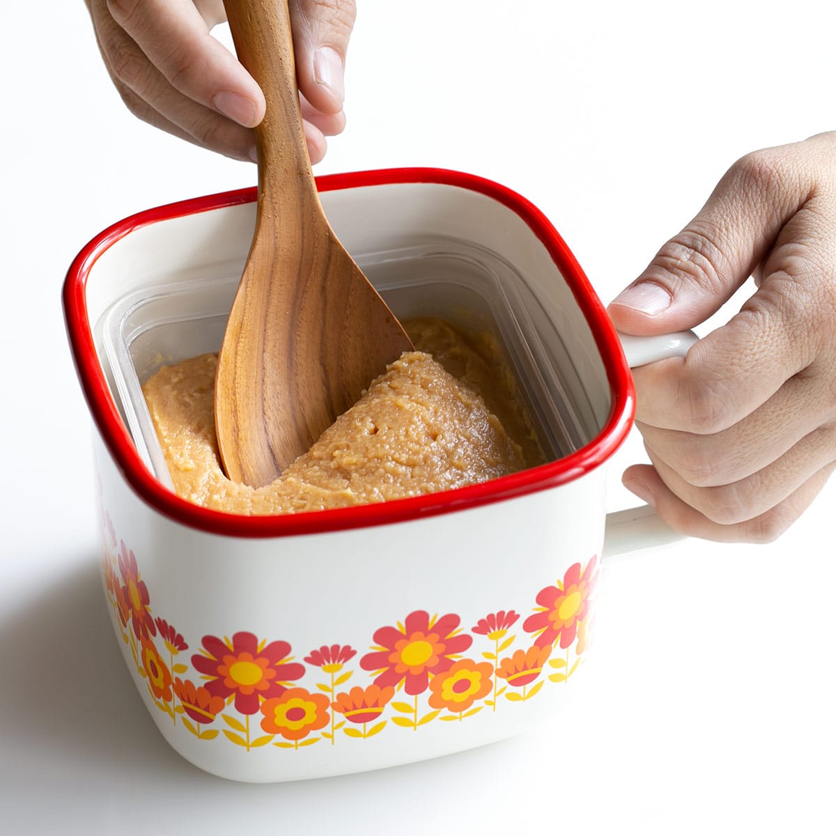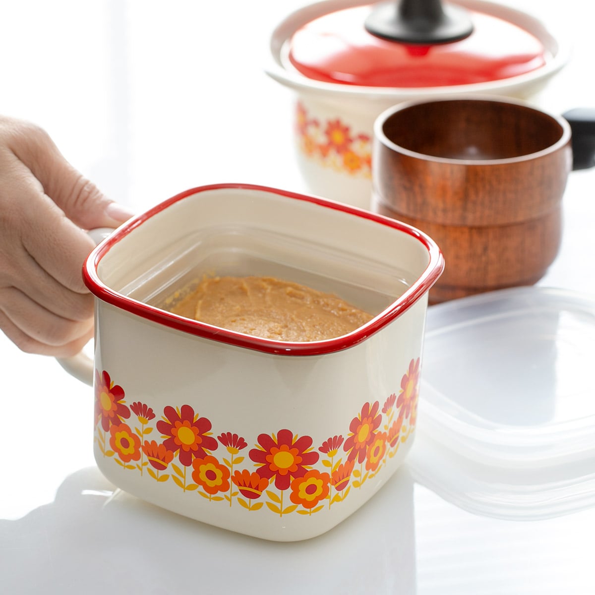 お味噌を入れて保存しておくのにピッタリなホーロー味噌ポットです。市販の味噌(750g)をパッケージのまま入れられるので、中身を入れ替える時間が短縮できます。鮮やかなレトロ柄のデザインはパッケージの目隠し用途にも最適です。また、いくつかの種類の味噌をポットの中で混ぜ合わせて、自分好みの味噌を作ることもできます。