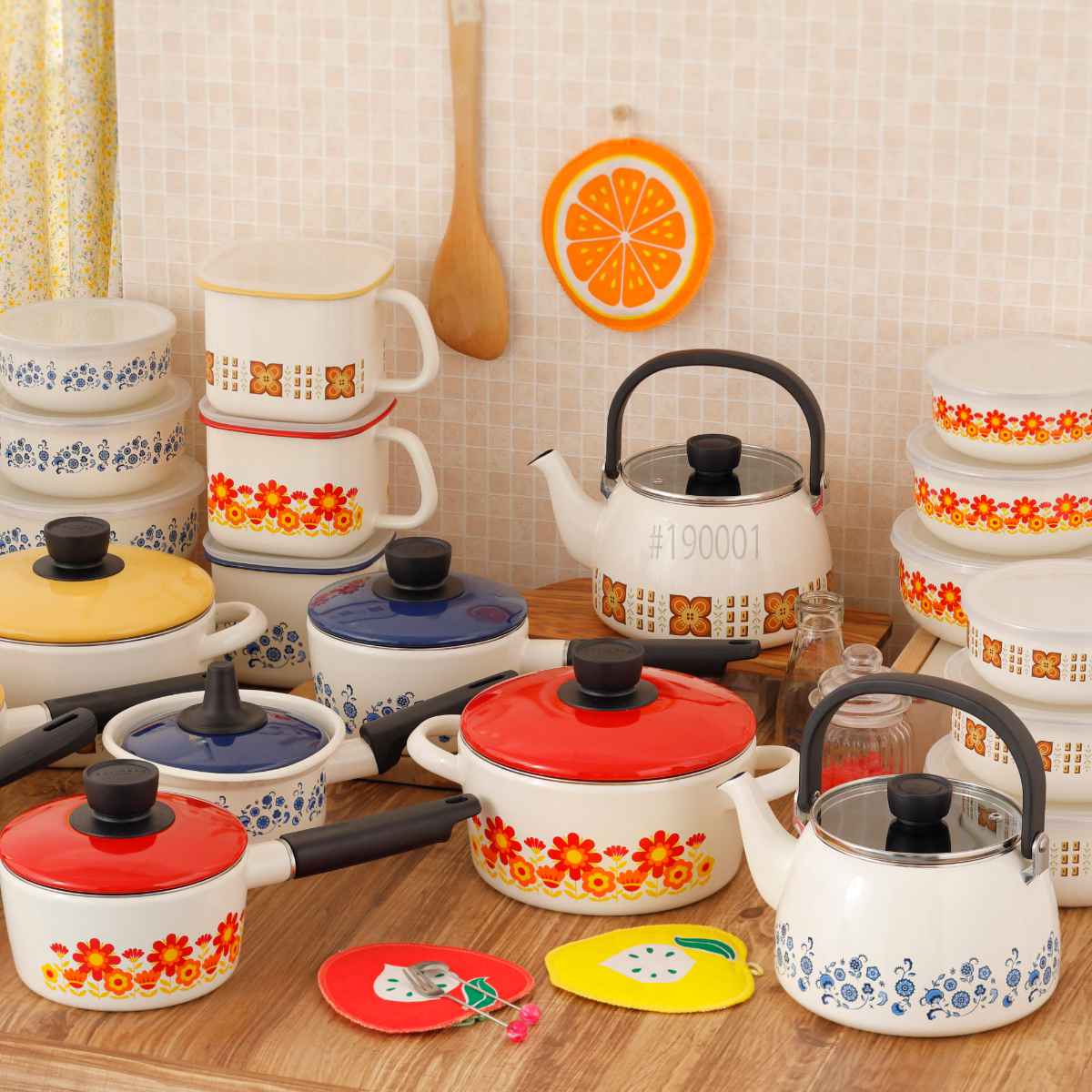 富士ホーロー75周年を記念して作られたメモリーズシリーズです。1970年代に人気を博した代表的なサンフラワー、ブルーフラワー、ゴールドナッツの3つのシリーズがピックアップされています。懐かしくレトロでありながら1周回って新しい、そんな時代の流れに思いを馳せつつキッチンライフが楽しめるシリーズです。