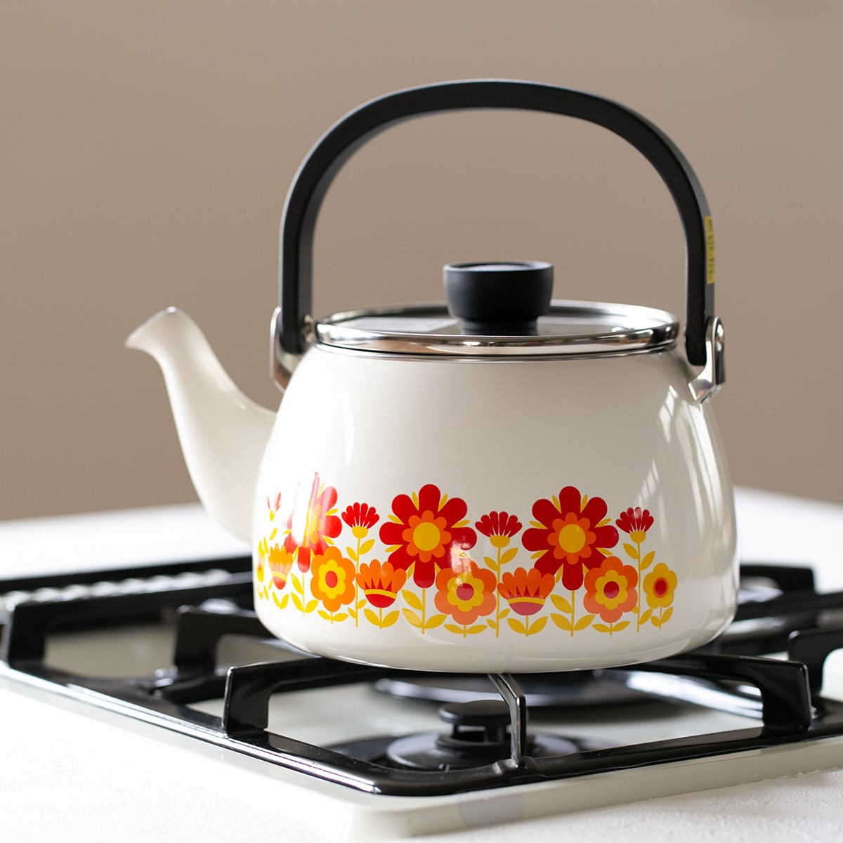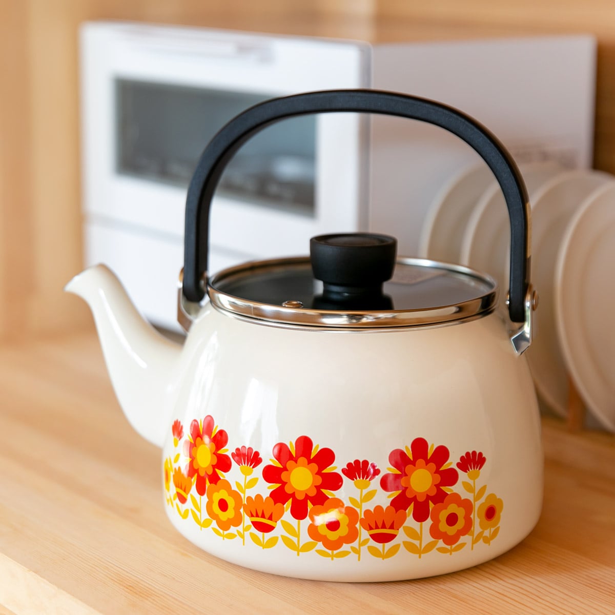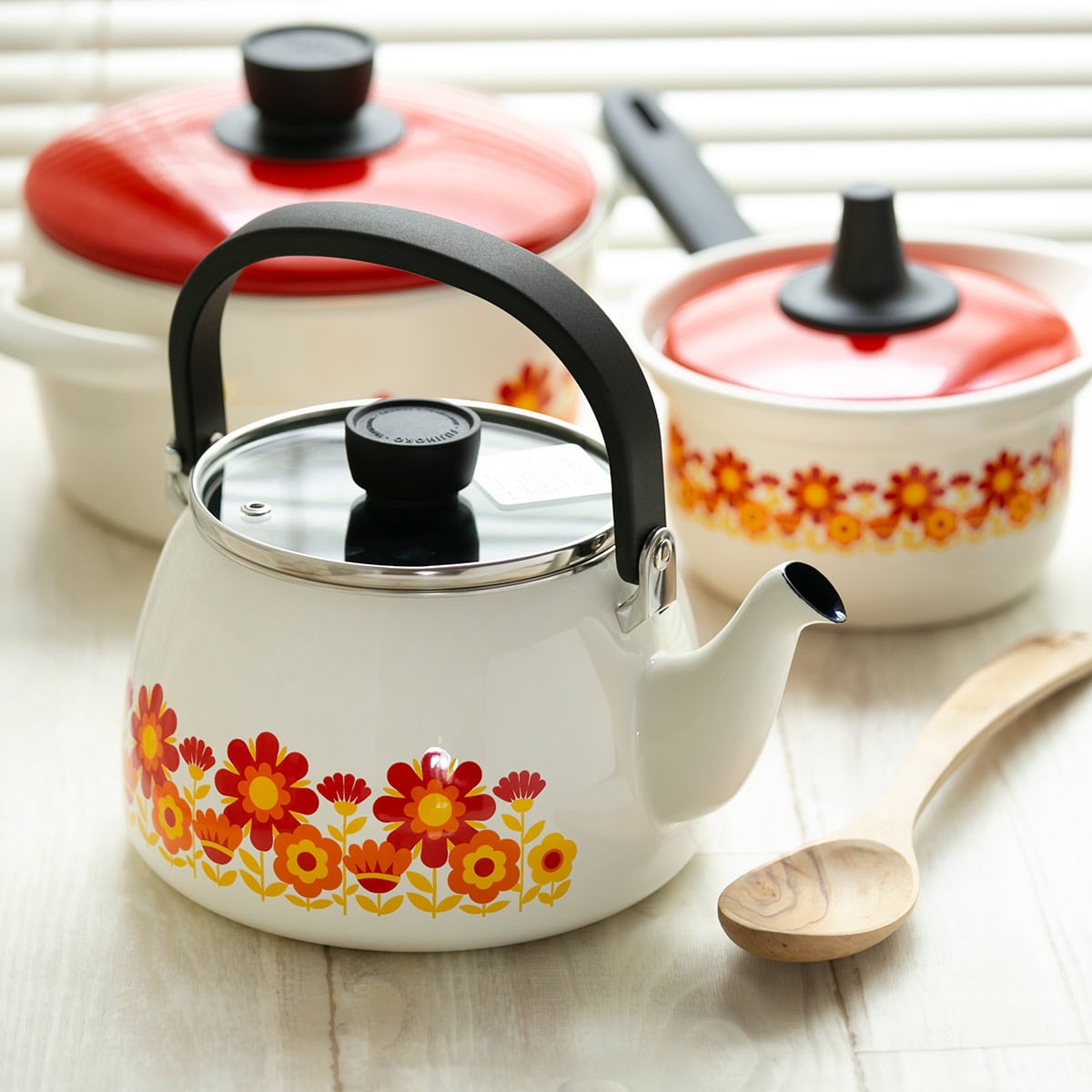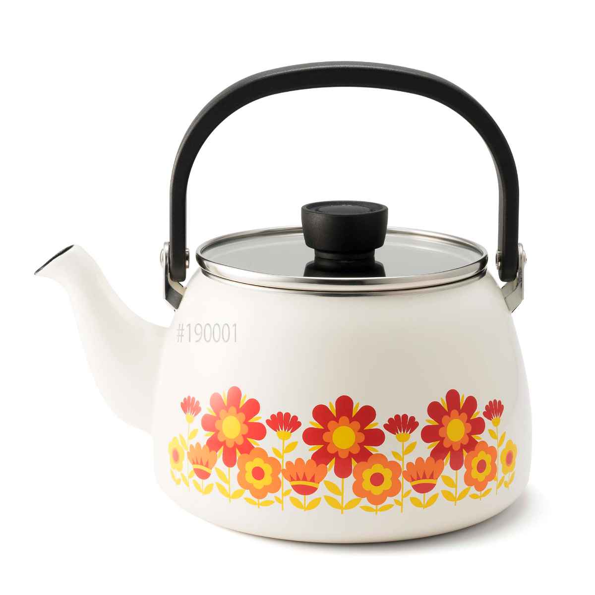 ひまわりをイメージしたポップなお花が映えるホーロー製のケトルです。どこか懐かしさを感じるレトロ風デザインは、1970年代に販売されていた復刻デザインです。鮮やかなカラーで、キッチンを明るく演出します。