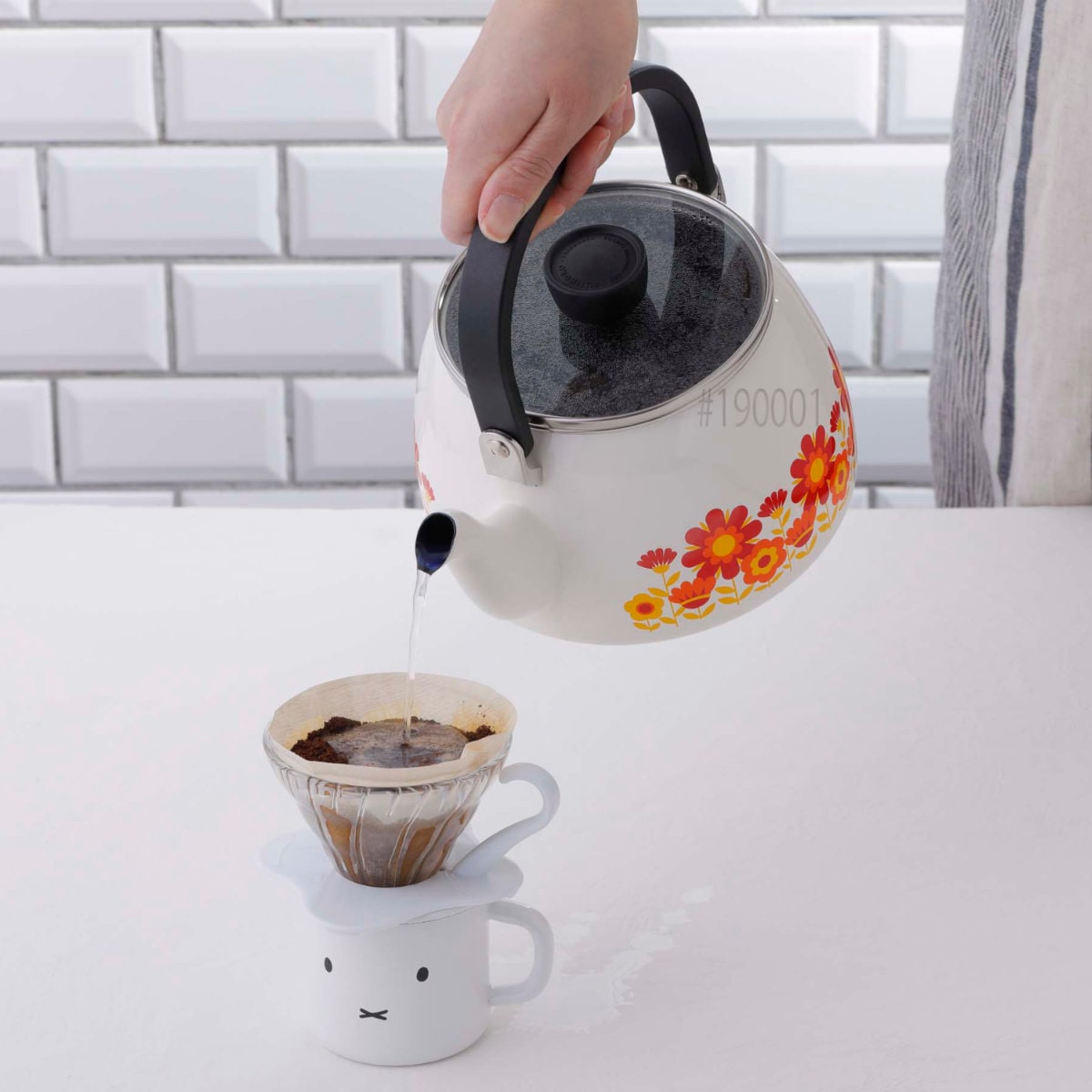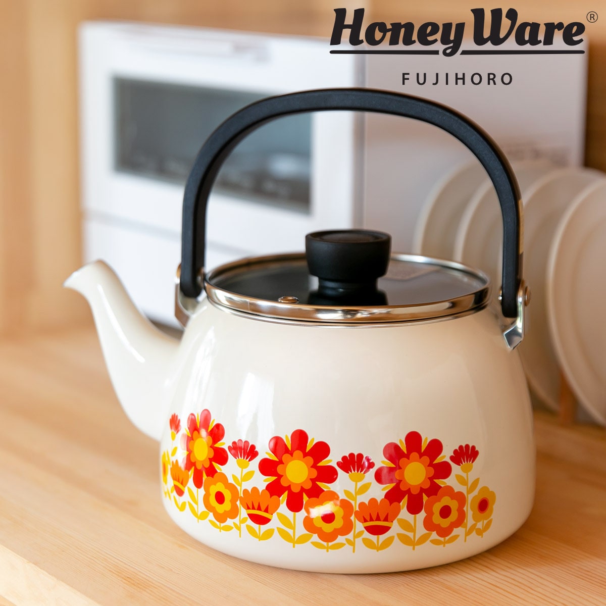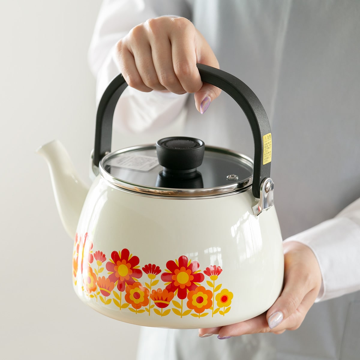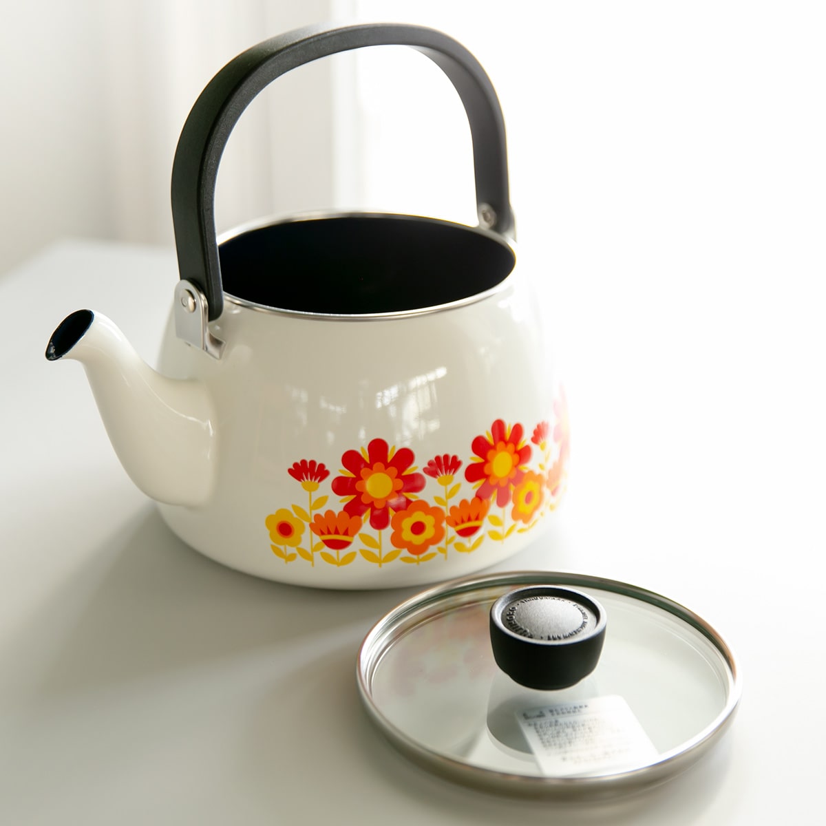 ひまわりをイメージしたポップなお花が映えるホーロー製のケトルです。どこか懐かしさを感じるレトロ風デザインは、1970年代に販売されていた復刻デザインです。鮮やかなカラーで、キッチンを明るく演出します。