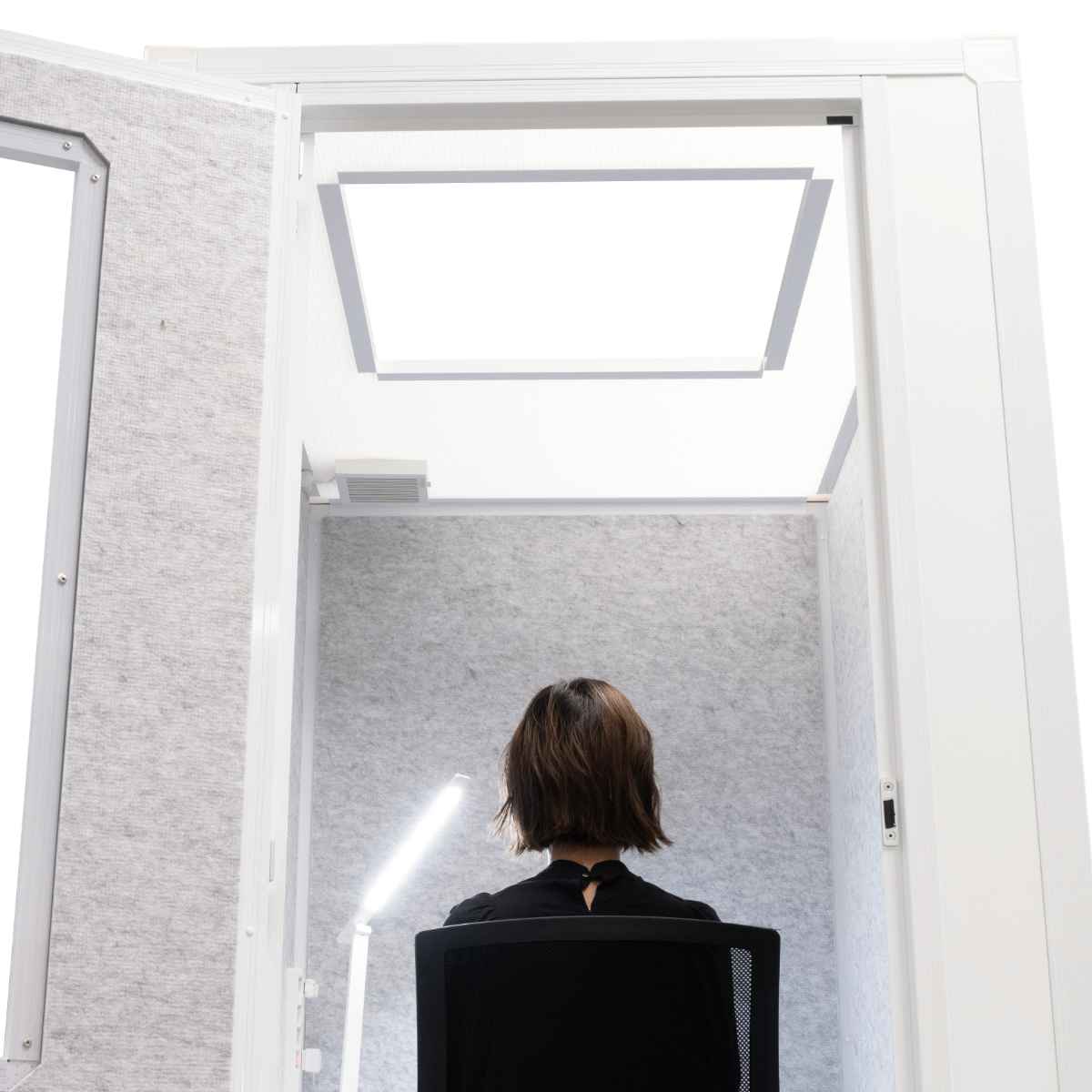 天面開口で中が明るく、閉塞感がなく快適にご使用いただけます。一般的な事務所内の騒音値は55dB~65dBです。10dB下がると、美術館や書店内の静けさになります。