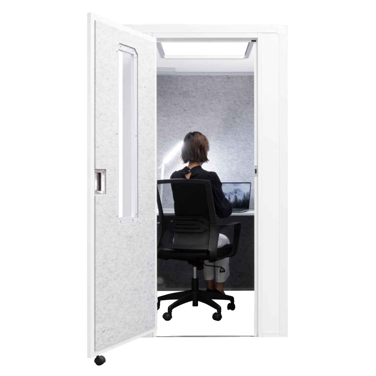 簡単に設置ができ防音効果に優れた『リミュートシリーズ』の吸音ブースに、テーブル付きの天井セミオープンタイプが登場しました。天面開口タイプで閉塞感が無く、吸音効果を保った扉一体型タイプです。窓付きの扉は、マグネット仕様でカチッと閉まり、キャスター付きなのでスムーズに開閉できます。組立も簡単に行え工事の必要もなく、軽量素材なので自由に移動が可能です。