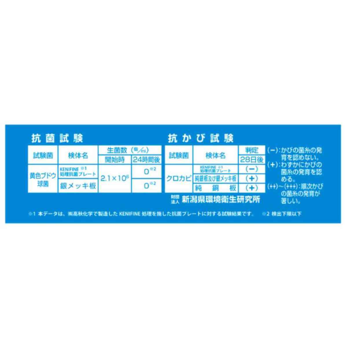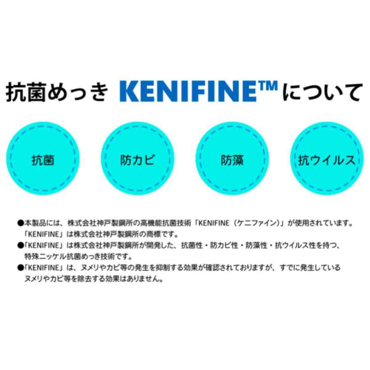 「KENIFINE」は株式会社神戸製鋼所が開発した、抗菌性・防カビ性・防藻性・抗ウィルス性を持つ、特殊ニッケル抗菌めっき技術です。こちらの製品には、高機能抗菌技術「KENIFINE( ケニファイン)」が使用されています。
