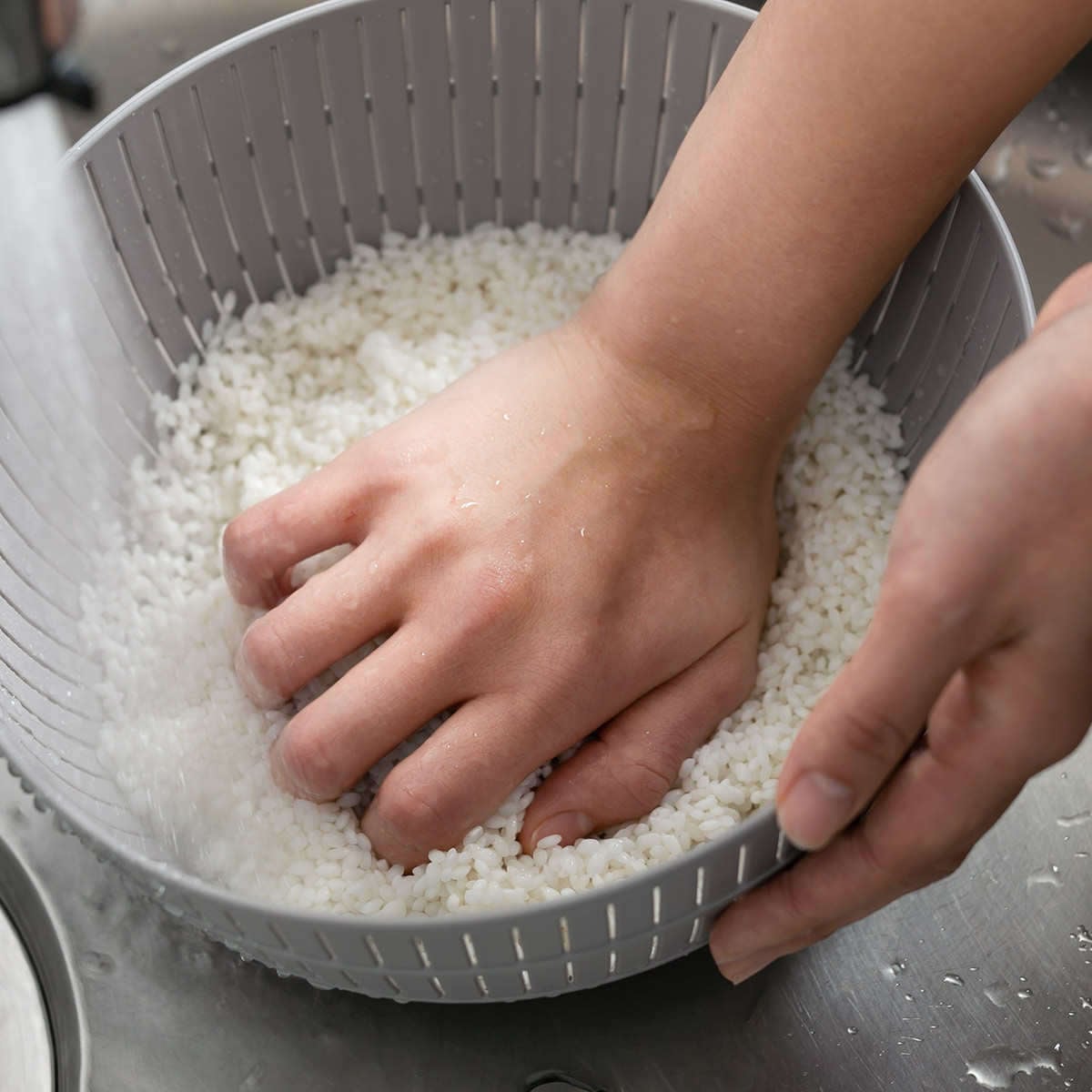 1.お米をザルに入れ水をかけ、ひと混ぜし、お米の表面の汚れをサッと流し落とします。1カップにつき、10回ほどお米を研ぎます。