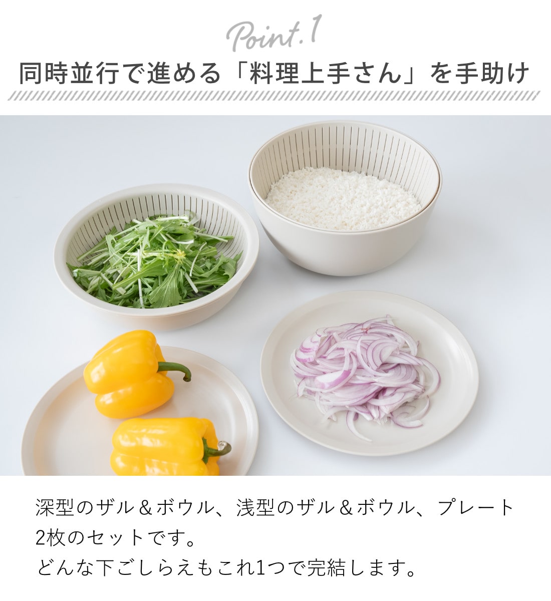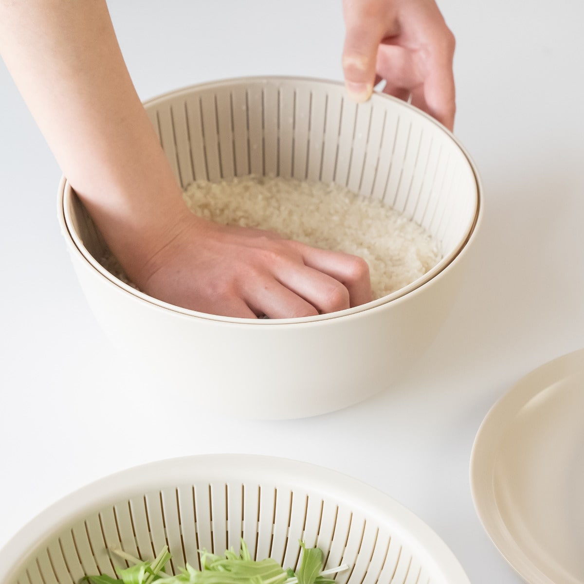 毎日のように食べるお米をよりおいしく炊くために、お米の研ぎ方に着目して生まれたザルとボウルの6点セットです。深型のザル&ボウル、浅型のザル&ボウル、プレート2枚のセットなので、毎日の調理を快適にサポートします。