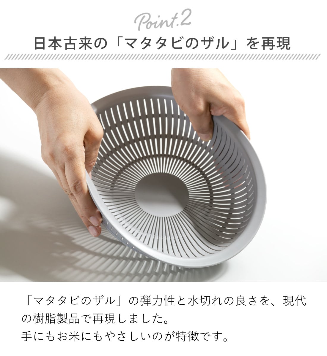 日本で古くから使われている「マタタビのザル」の弾力性と水切れの良さを樹脂製品で再現しました。金属製のザルに比べてお米が傷つかず、手にもお米にもやさしいのが特徴です。