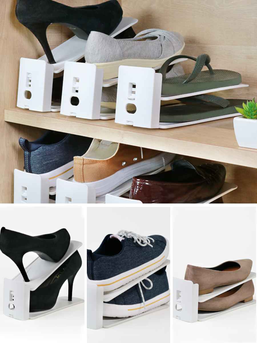 靴1足分のスペースで2足を収納することができる靴ホルダーです。狭い下駄箱スペースを有効活用することで収納力が2倍にアップします。高いヒールやスニーカー、ローファーなど様々な種類の靴を収納できます。