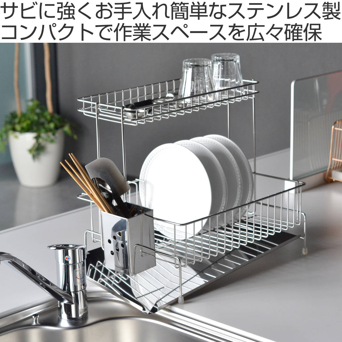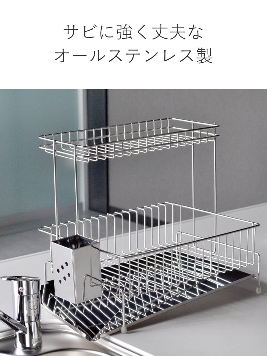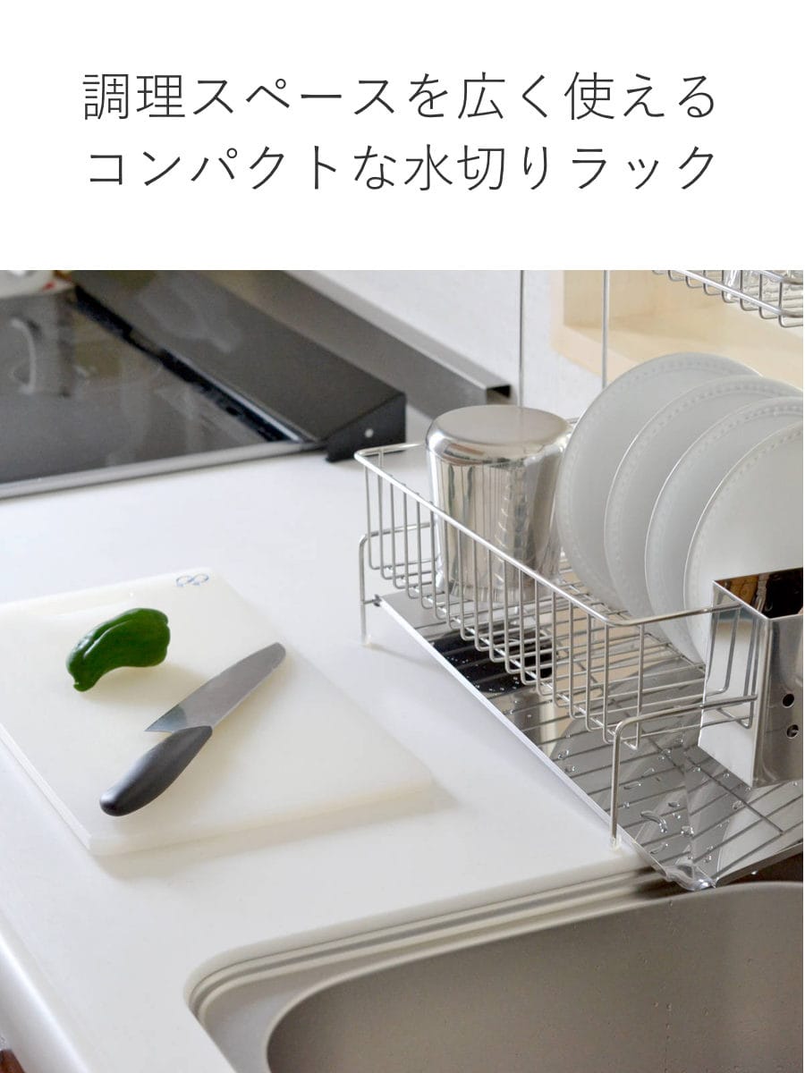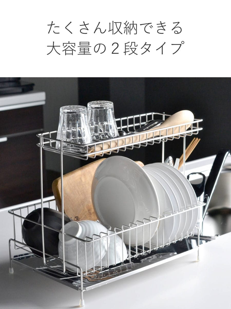 キッチンで場所を取りたくない方や、食洗機のサブとしてもピッタリなコンパクトな2段水切りラックです。水をトレーの角から排水することで、水切りラック本体をキッチンの奥に置くことができ、作業スペースを広々確保できます。また、上段下段に分かれた2段タイプの水切りラックなので、食器の種類によって置く場所を分けたり、よく使うものは取り出しやすい上段に置いたりと自由に使い分けができます。