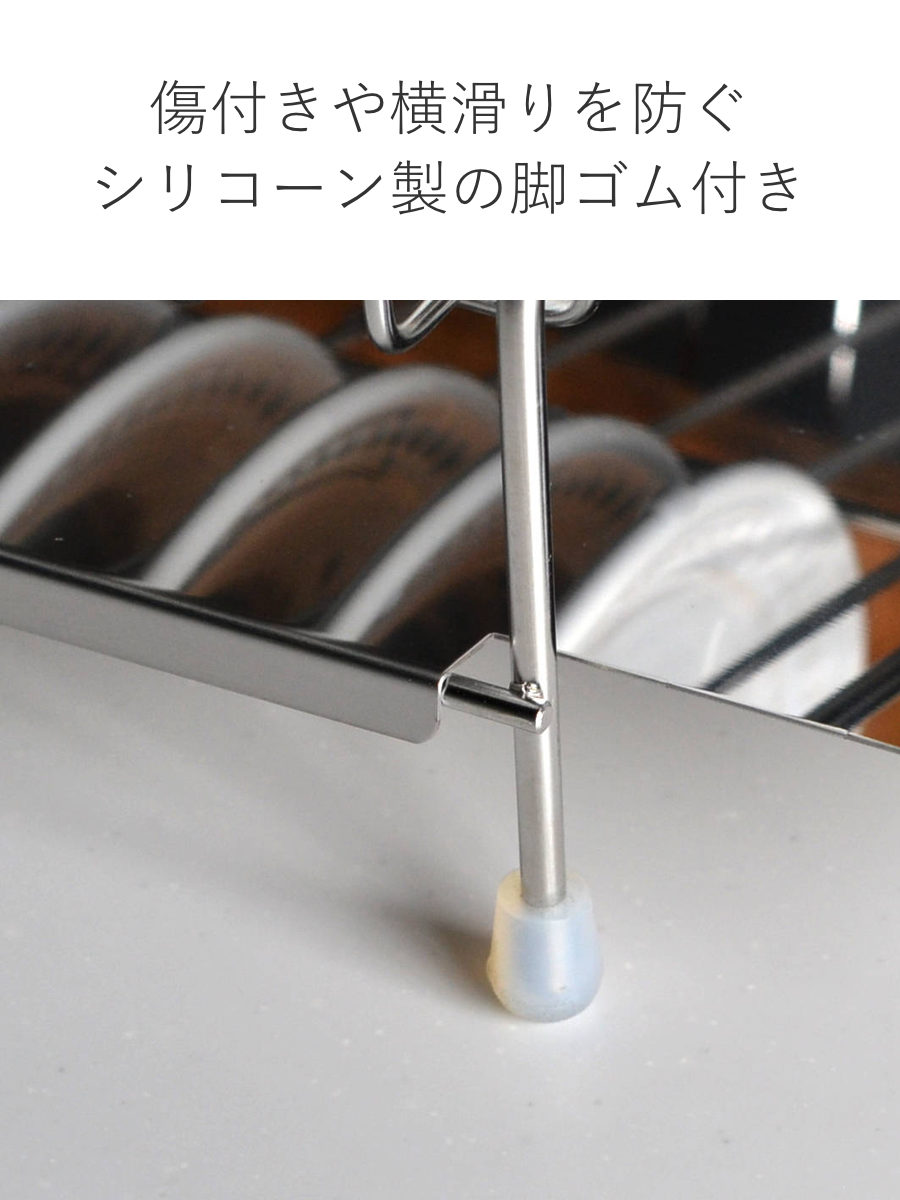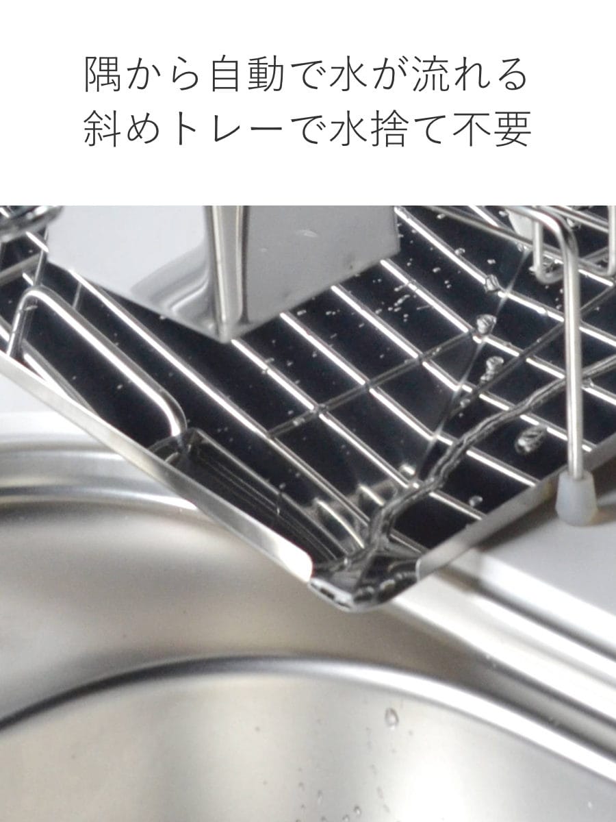 食器から落ちた水が自然にシンクに流れる傾斜の付いたトレーで排水の手間がいりません。水がたまることで発生する水アカやヌメリを予防してくれます。また、トレーは取り外して洗うことができるので、清潔に使うことができます。
