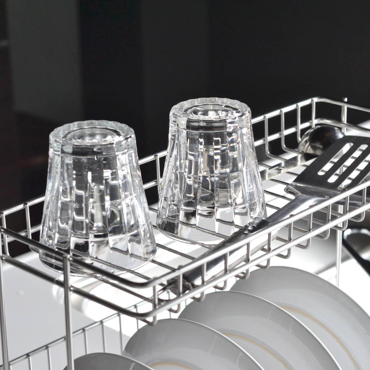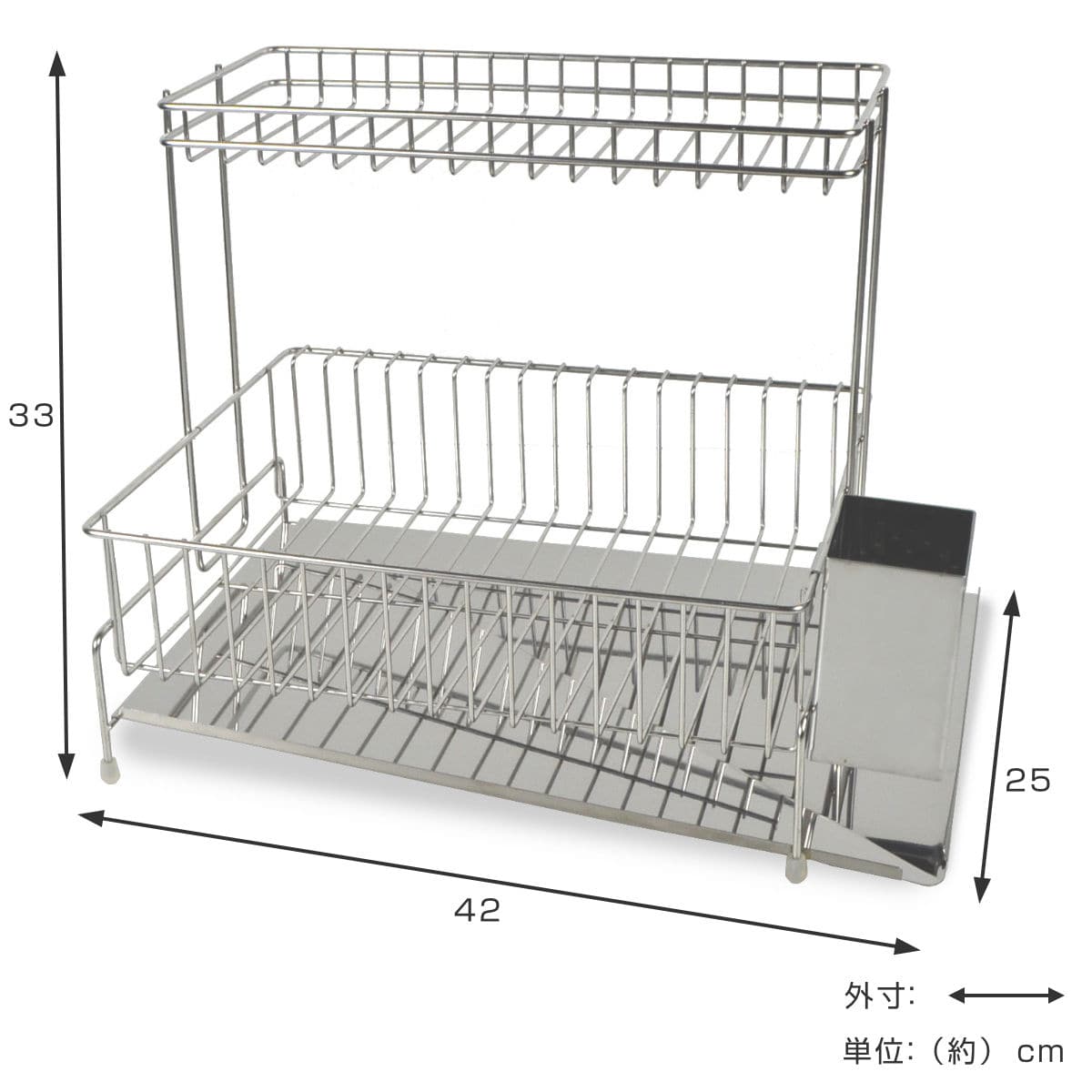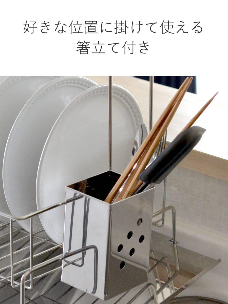 小物を乾かすのに便利な上段カゴと箸立てが付いています。上段カゴはグラスやお茶碗、水筒のパッキンなど細々した物を置くのに便利です。また、箸立てはカトラリーや計量スプーンなどを入れるのにピッタリです。