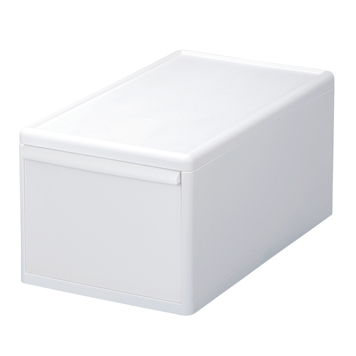 幅が違うサイズであっても、隙間無く境目を跨いで積み重ねできます。収納場所、収納したい物の大きさに合わせて階段状や真四角などお好みで自由にカスタマイズが可能。シンプルなフォルムが美しいホワイトカラーのボックスを組み合わせてスタッキングする事で、お部屋から生活感を隠し、洗練された印象を与えます。