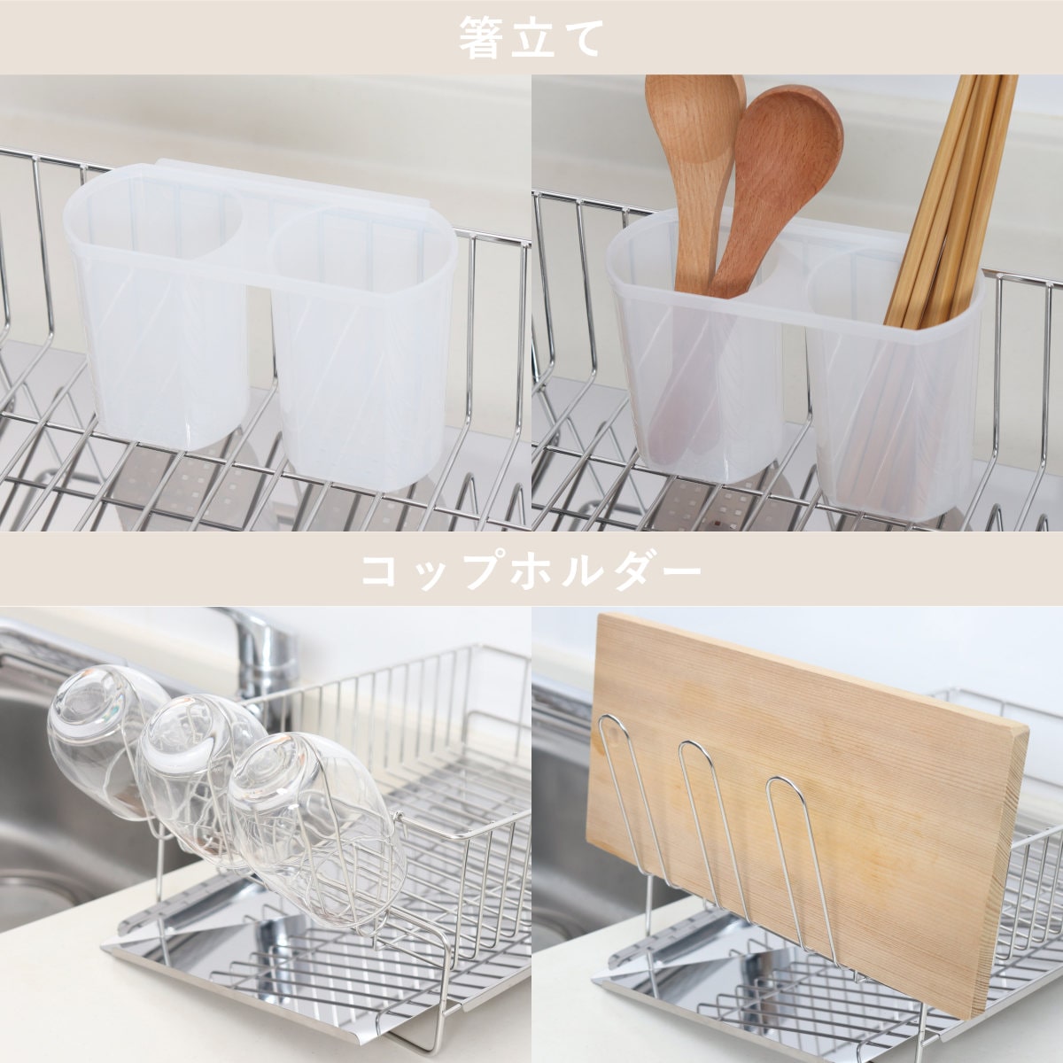 グラスホルダーには、グラスやタンブラー、まな板や鍋蓋を立て掛けることができます。