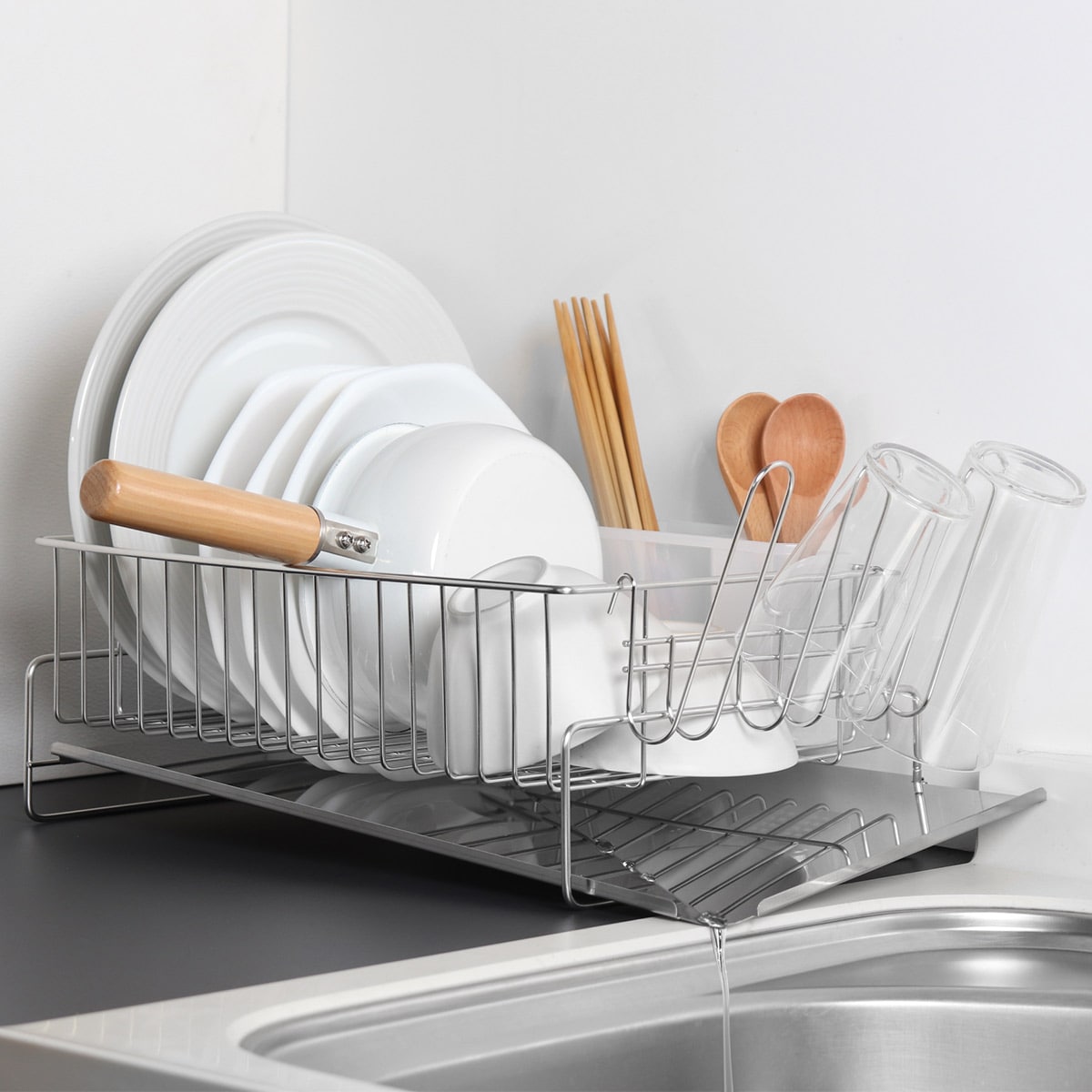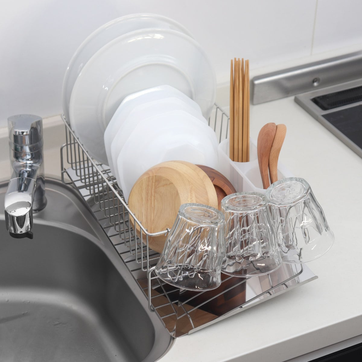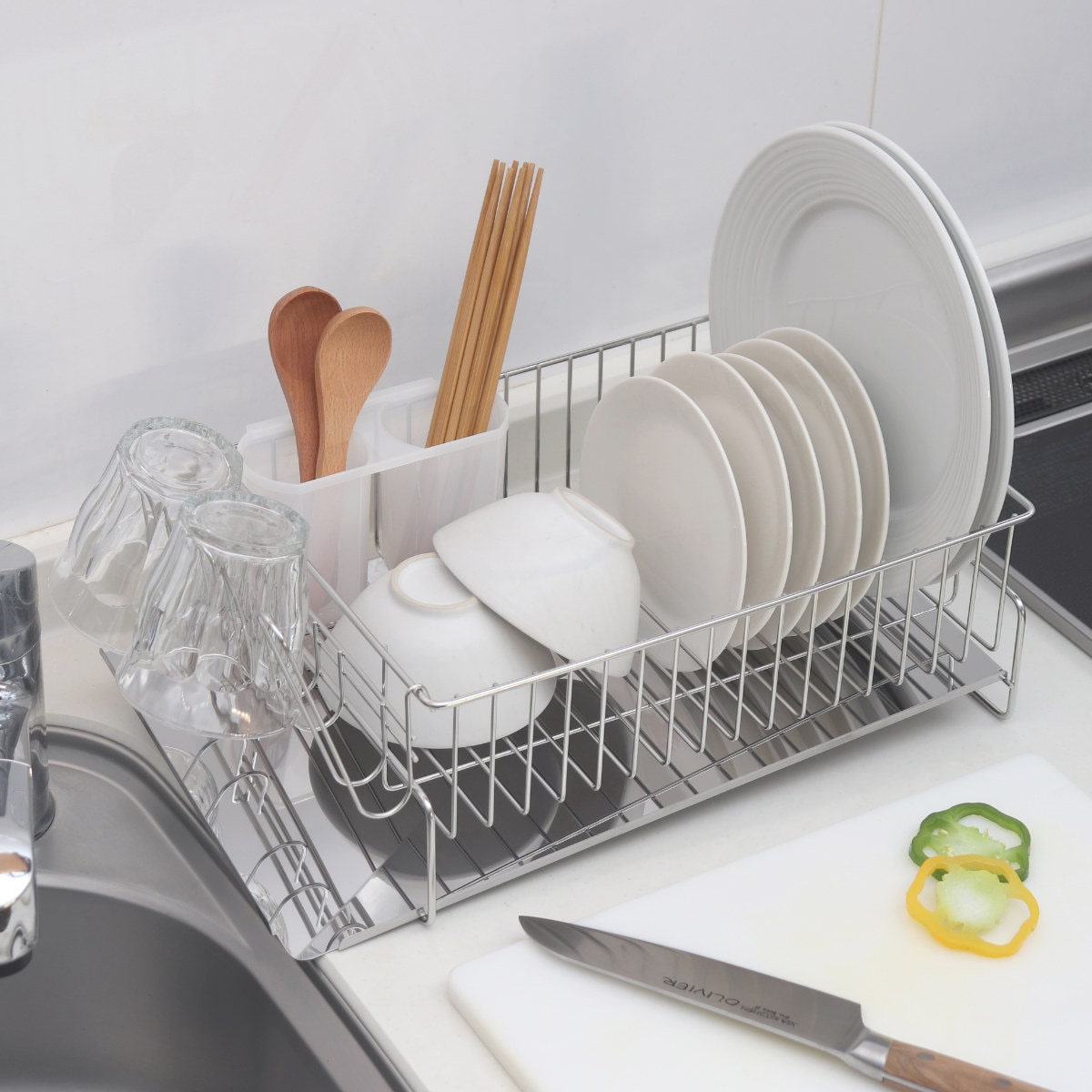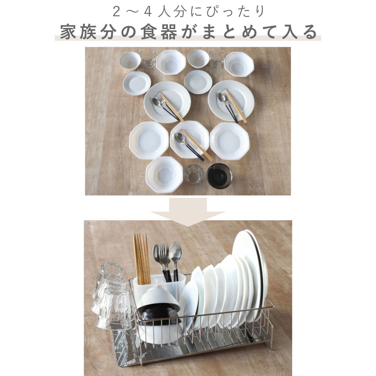 2~4人分の食器をまとめて入れられる水切りラックは、少人数でもファミリーでもメインで使えるサイズです。