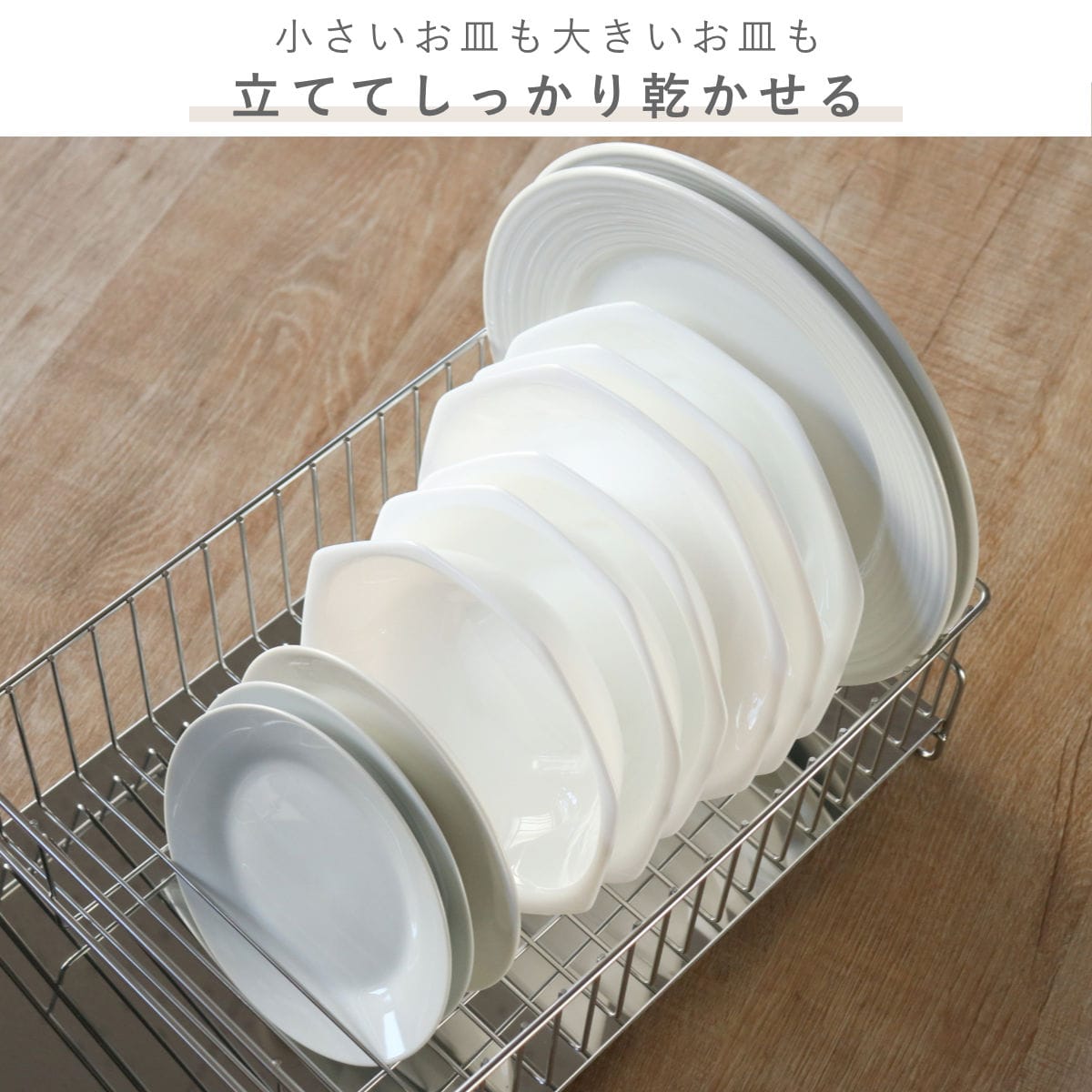 しっかりとした太さのワイヤーは、約1.7cmの間隔で配置され小皿から大皿までしっかり受け止めます。